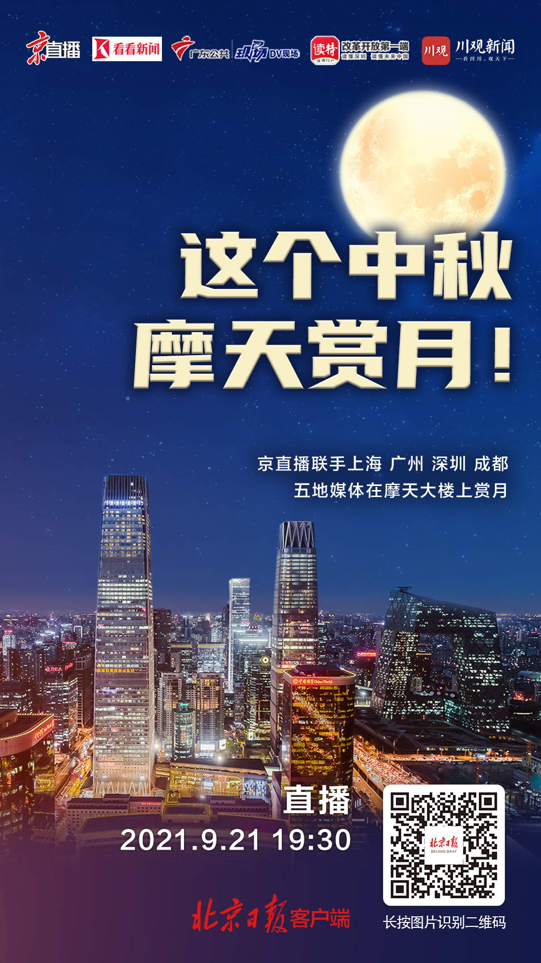 正值中秋佳节,京直播特别推出联动直播,邀您登高同赏明月,共度佳节!北京日报客户端京直播联动上海看看新闻、广东电视台DV现场、深圳特区报读特新闻和四川日报川观新闻,共五地媒体携手,邀您在摩天大楼上赏月……您将从北京国贸大酒店、上海中心大厦、广州塔“小蛮腰”、深圳湾区之光摩天轮、成都春熙路西部文化产业中心等城市高点俯瞰,月色醉人,夜色迷人!
