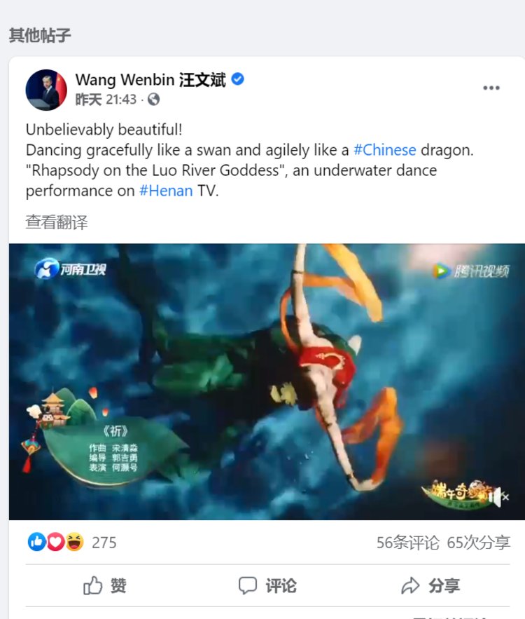 他点赞《端午奇妙游》的水下舞蹈节目《洛神水赋》说:“难以置信的美丽!翩若惊鸿,婉若游龙。《洛神水赋》,河南卫视的一支水下舞蹈表演。”