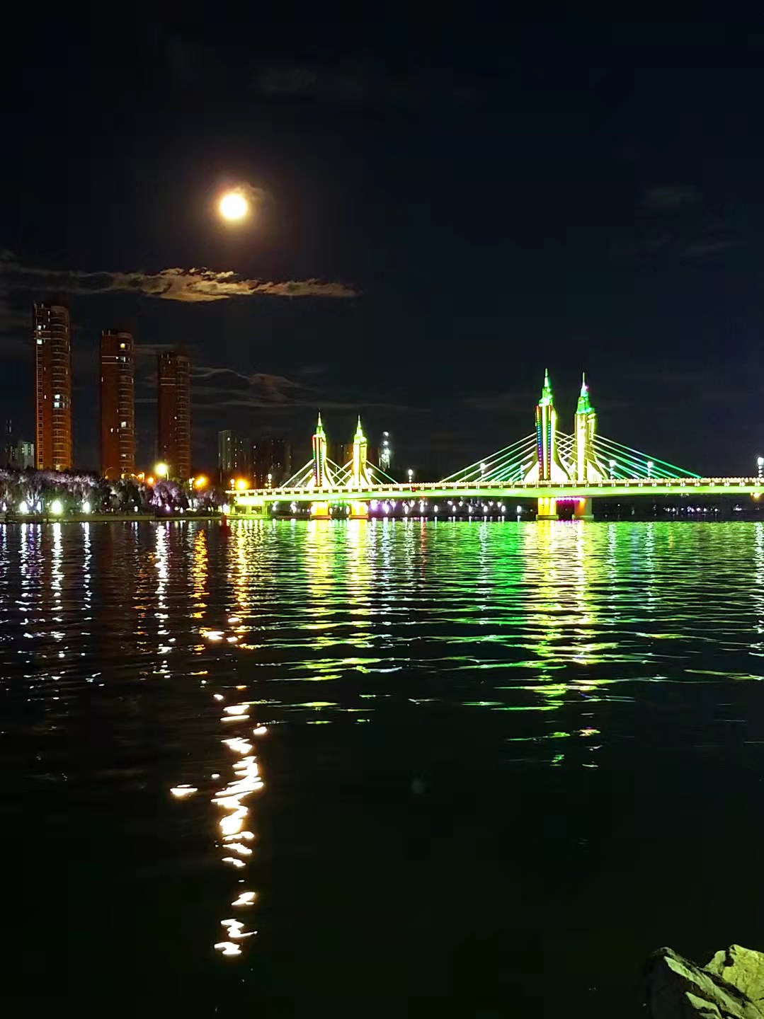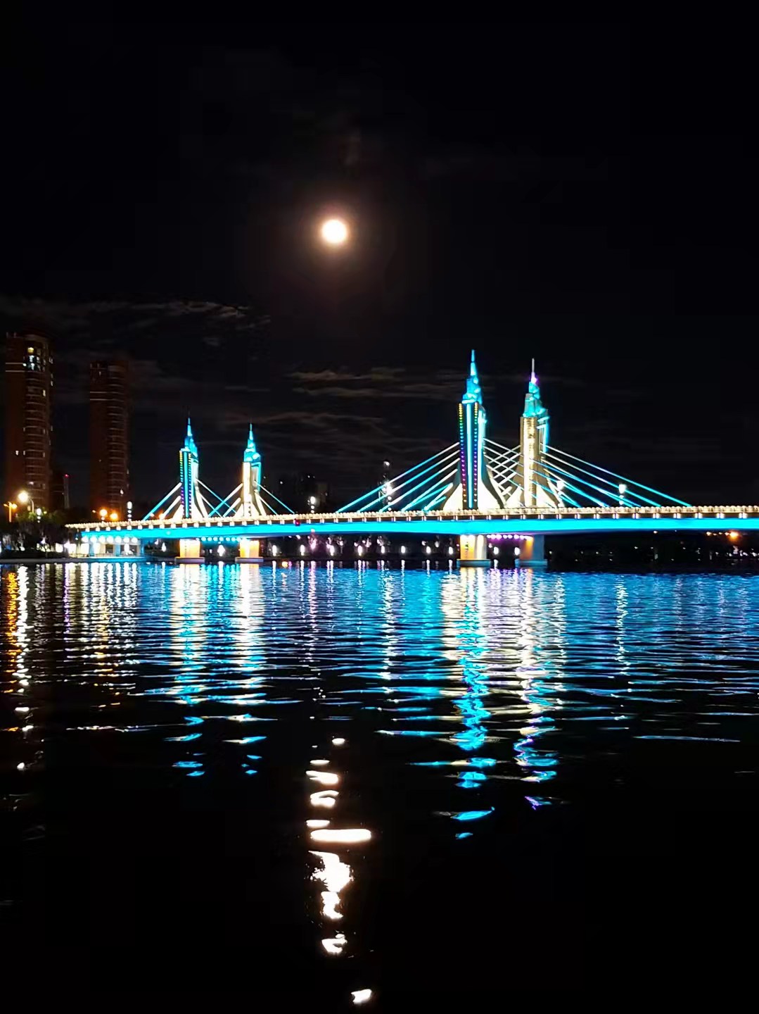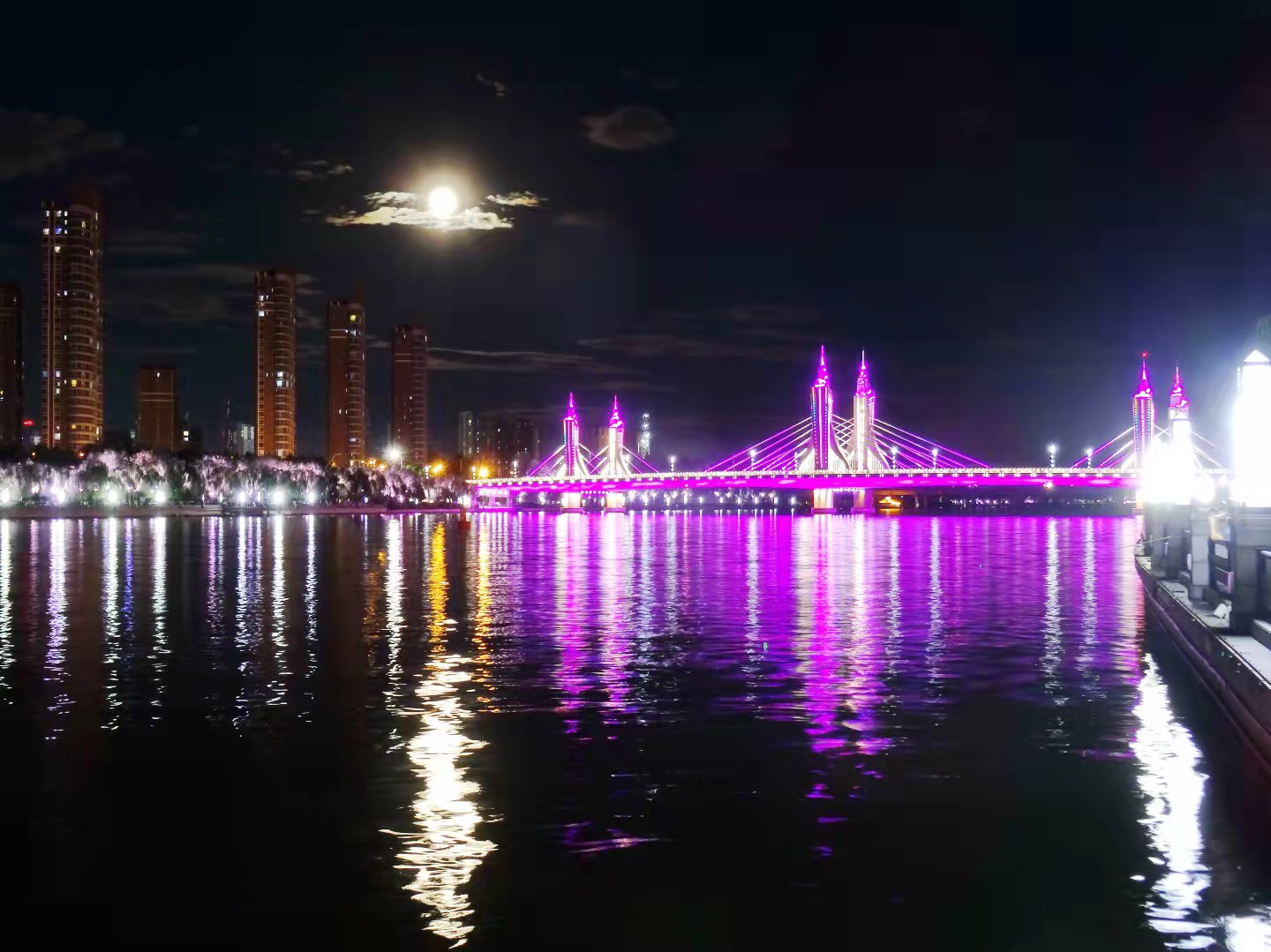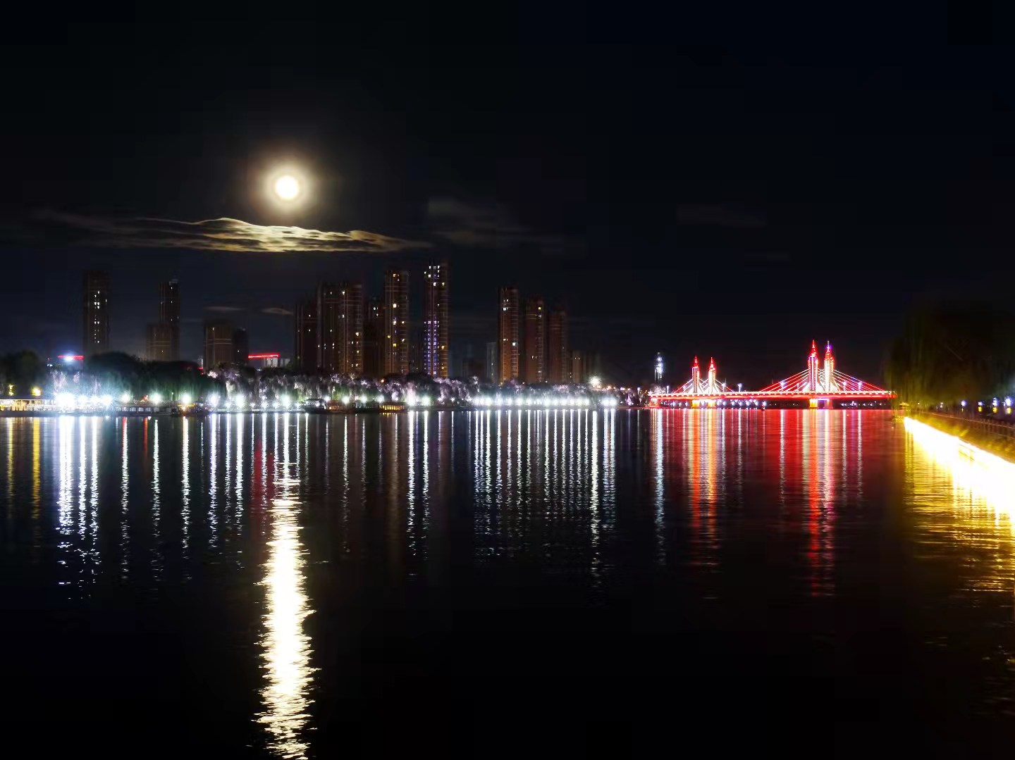傍晚彩霞落下,天上月亮升起,水中溢满清光。圆月在大运河里铺成金色鱼鳞,与岸边的绚丽灯光秀交相辉映。一起来欣赏大运河畔的流光溢彩!