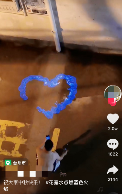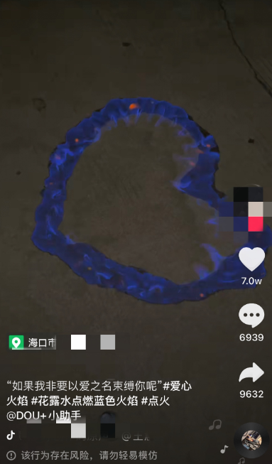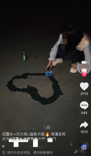 近日,短视频平台刮起一阵“花露水+打火机=蓝色火焰”的“浪漫”玩法,不少年轻人用花露水在地上画出一个心形,然后用打火机点燃,随即可以烧成一个蓝色的爱心。消防部门提醒,花露水酒精含量一般在70%左右,操作不当可能灼伤自己,甚至引发火灾事故。