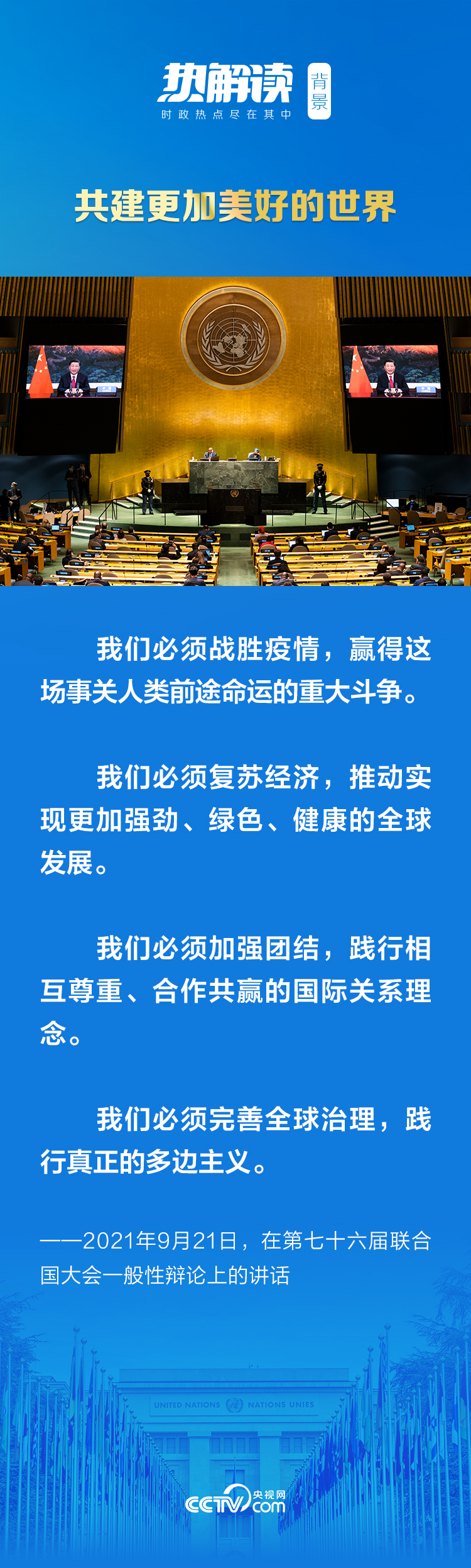 9月21日,习近平主席以视频方式出席第七十六届联合国大会一般性辩论,并发表题为《坚定信心 共克时艰 共建更加美好的世界》的重要讲话。