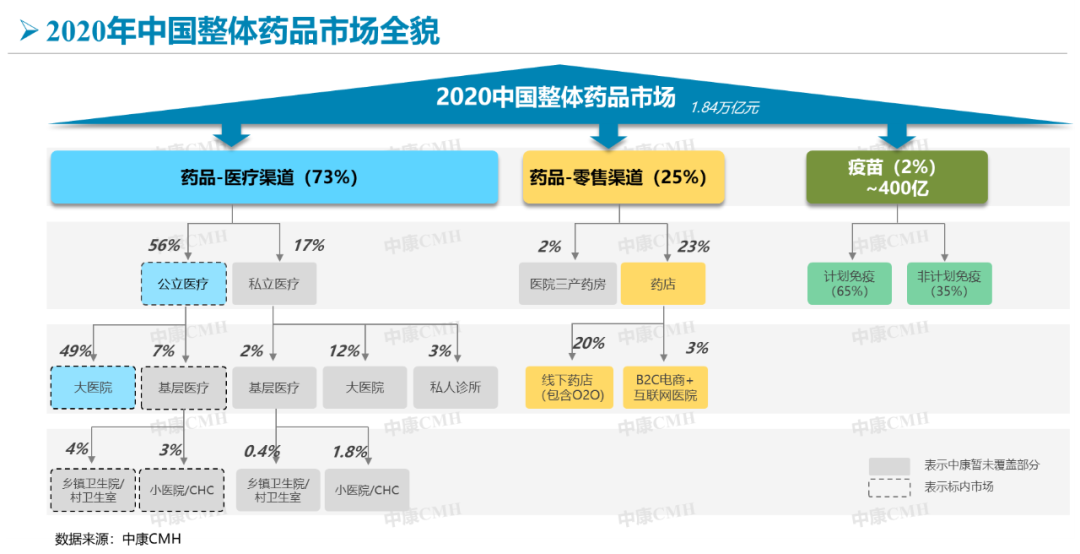 中康CMH数据显示,2020年中国全渠道药品(含疫苗)市场达1.84万亿元,同比2019年下滑5.2%;其中,全国医院药品销售规模达8979亿元人民币,同比2019年增速下滑10.1%;零售渠道市场份额扩大到25%,疫情驱动下,B2C和互联网医院市场份额增加到3%。