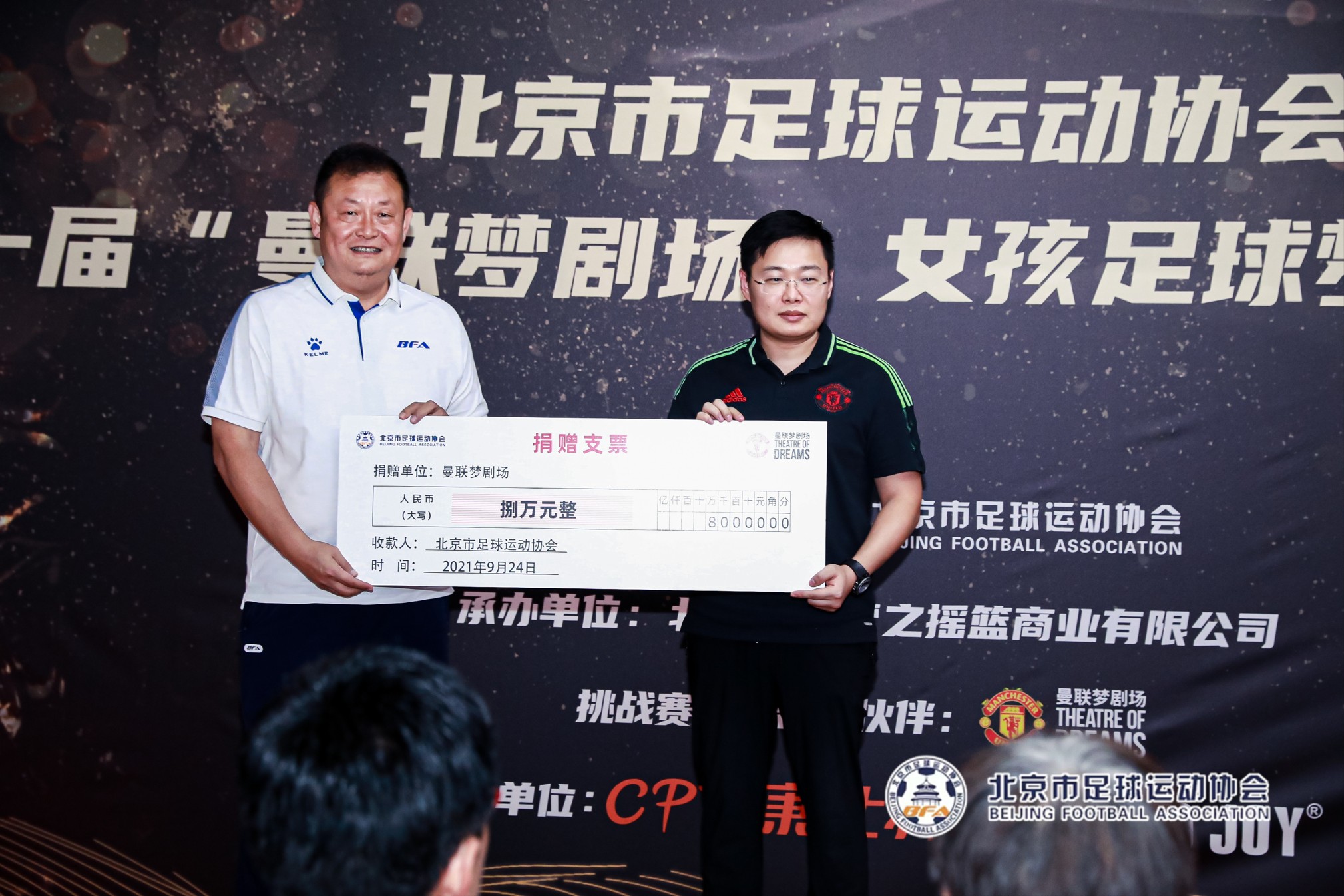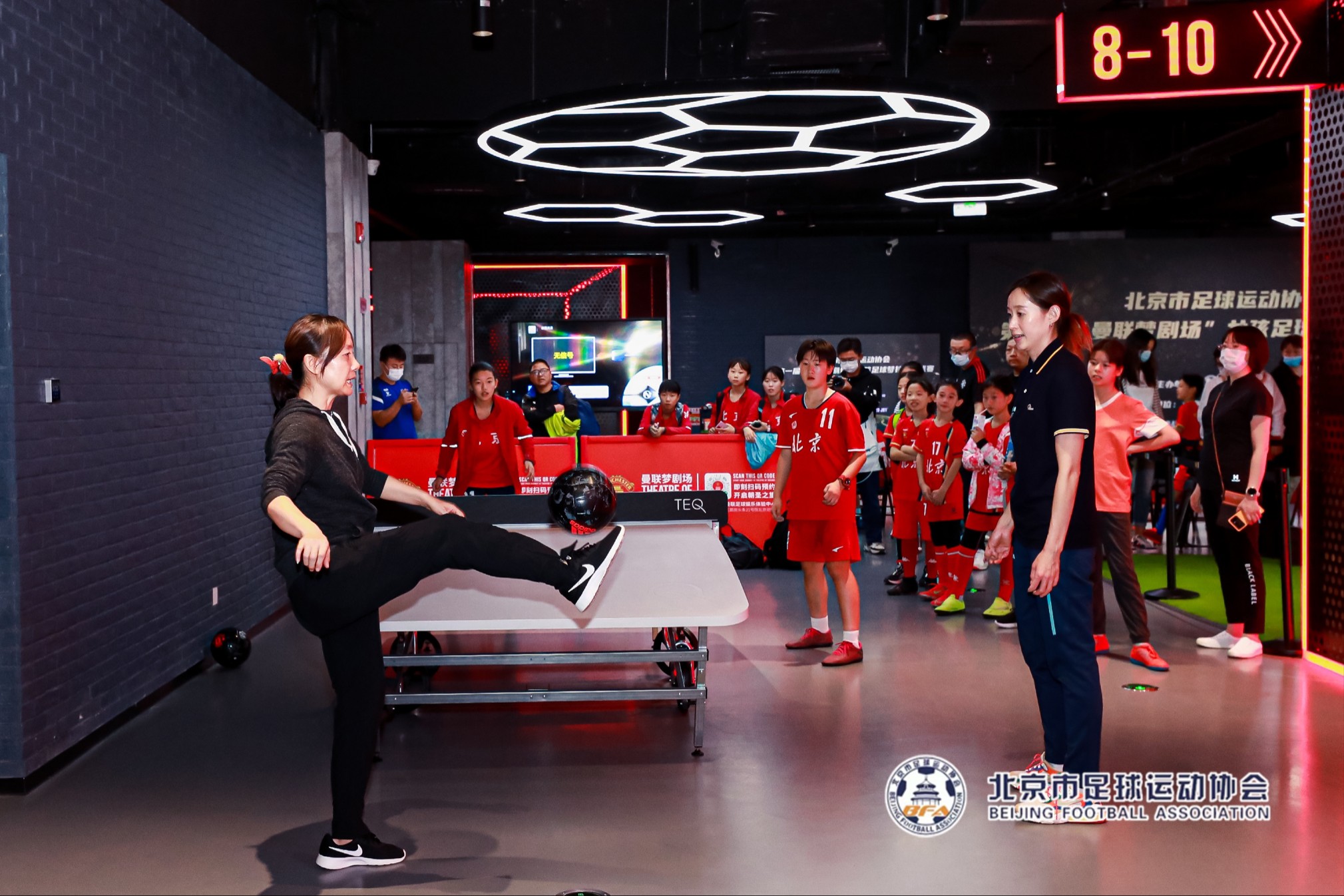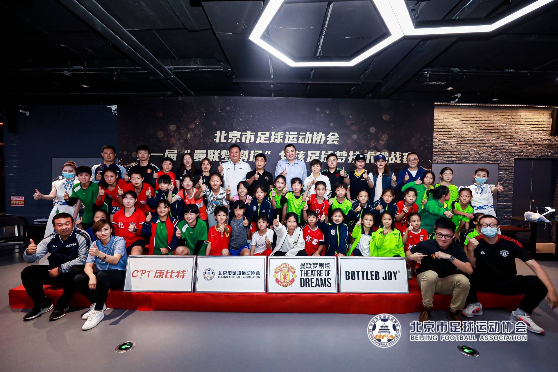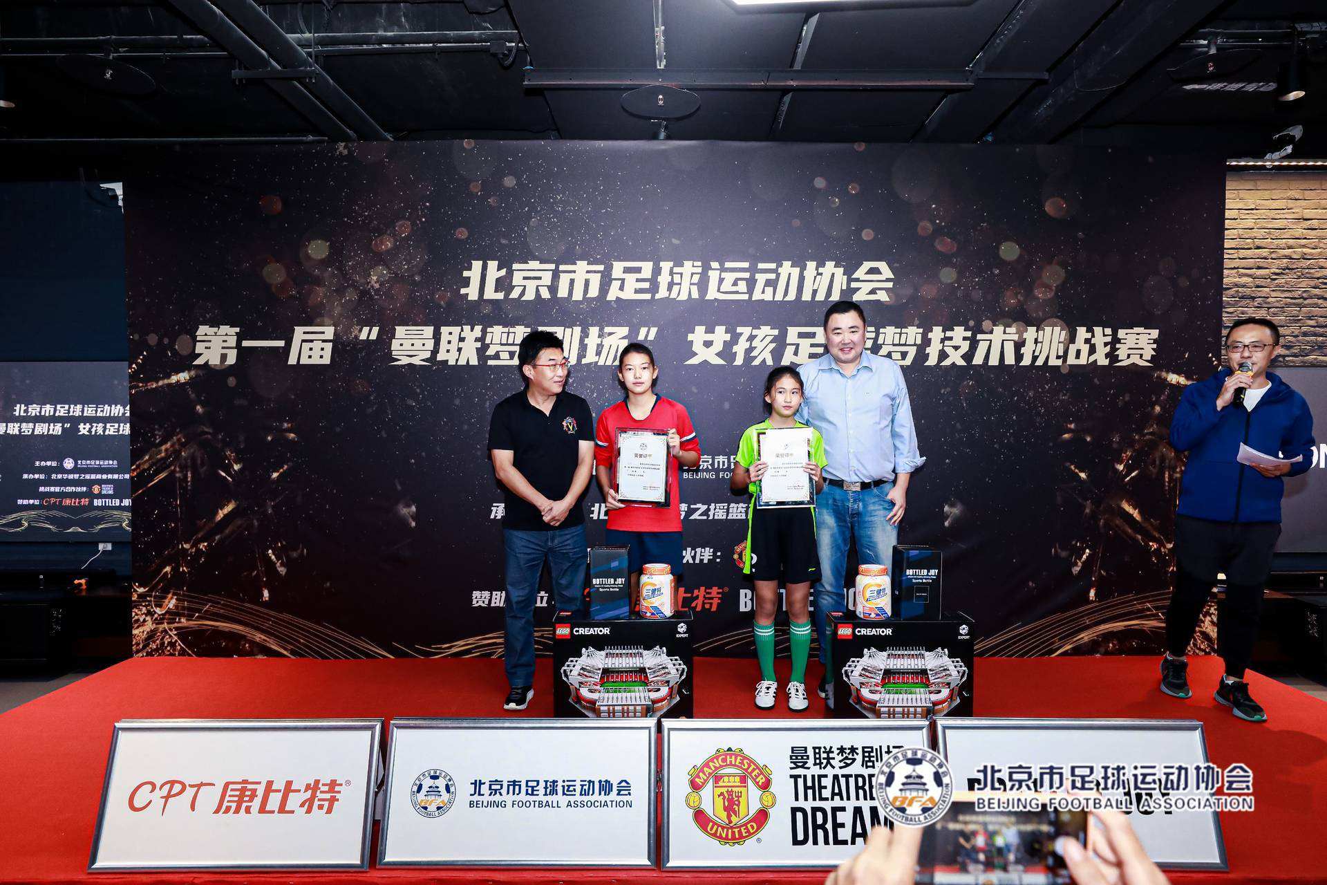 9月24日,北京市足协副主席花雷、北京市足协副主席武又文、北京市足协副秘书长陈长红、中国女足名宿刘爱玲、中国足球发展基金会青少部部长王丽萍以及前中国女足国脚张彤、施萌雨、王丹丹、江帅等人来到曼联梦剧场,出席由北京市足球运动协会主办,北京华锐梦之摇篮承办,康比特、BOTTLED JOY赞助的北京市足球运动协会第一届“曼联梦剧场”女孩足球梦技术挑战赛的颁奖仪式和闭幕典礼。