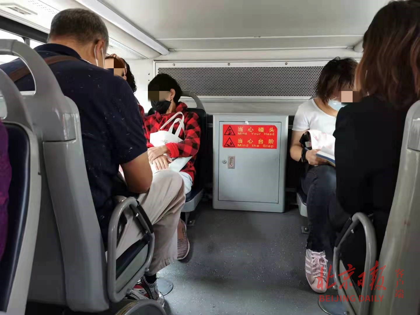 据连日观察,记者发现目前北京市的确有不少公交线路取消了末排中间座,如公交695路、332路、951路等。这些中间座被取消后,有的设置为灰色箱体,有的加装了安全杠,上面还贴着“当心碰头当心台阶”等安全提示。