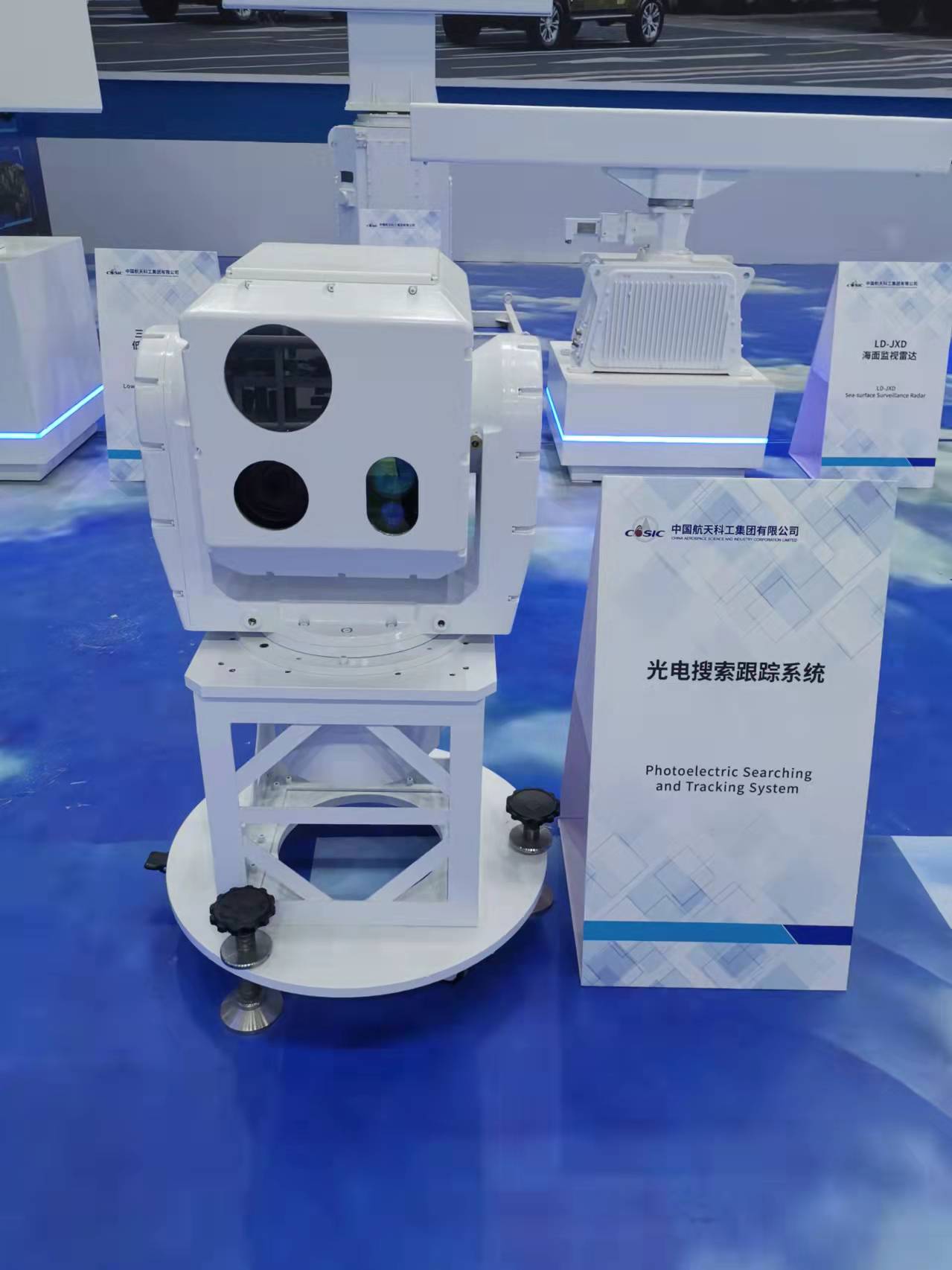 光电搜索跟踪系统采用搜索跟踪一体化设计,可以对指定区域进行360°全方位连续搜索,为其他设备提供目标引导信息,同时根据需要转入目标跟踪状态,能够在复杂环境下弥补雷达低空探测能力不足,适用于车载或固定平台。本届航展展出的光电搜索跟踪系统全新升级,探测距离进一步提升,并增加了基于深度学习的智能识别功能,可对多种目标进行准确探测、识别和预警,尤其是对无人机等低空飞行弱小目标的探测更具有独特的优势。
