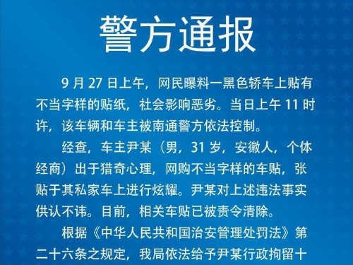 ▶ 南通一车主车身现不当字样还炫耀,警方:行拘15日