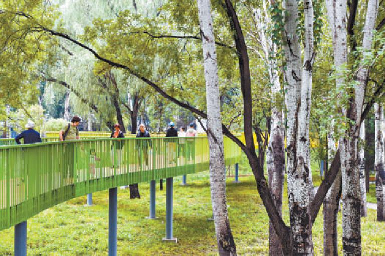 林间漫步景观设置空中栈道,让游人亲近绿色。