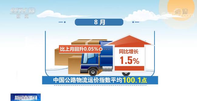 另外,公路物流市场总体平稳,短期因素影响下,运输价格小幅提升。8月,中国公路物流运价指数平均100.1点,同比增长1.5%,比上月回升0.05%。