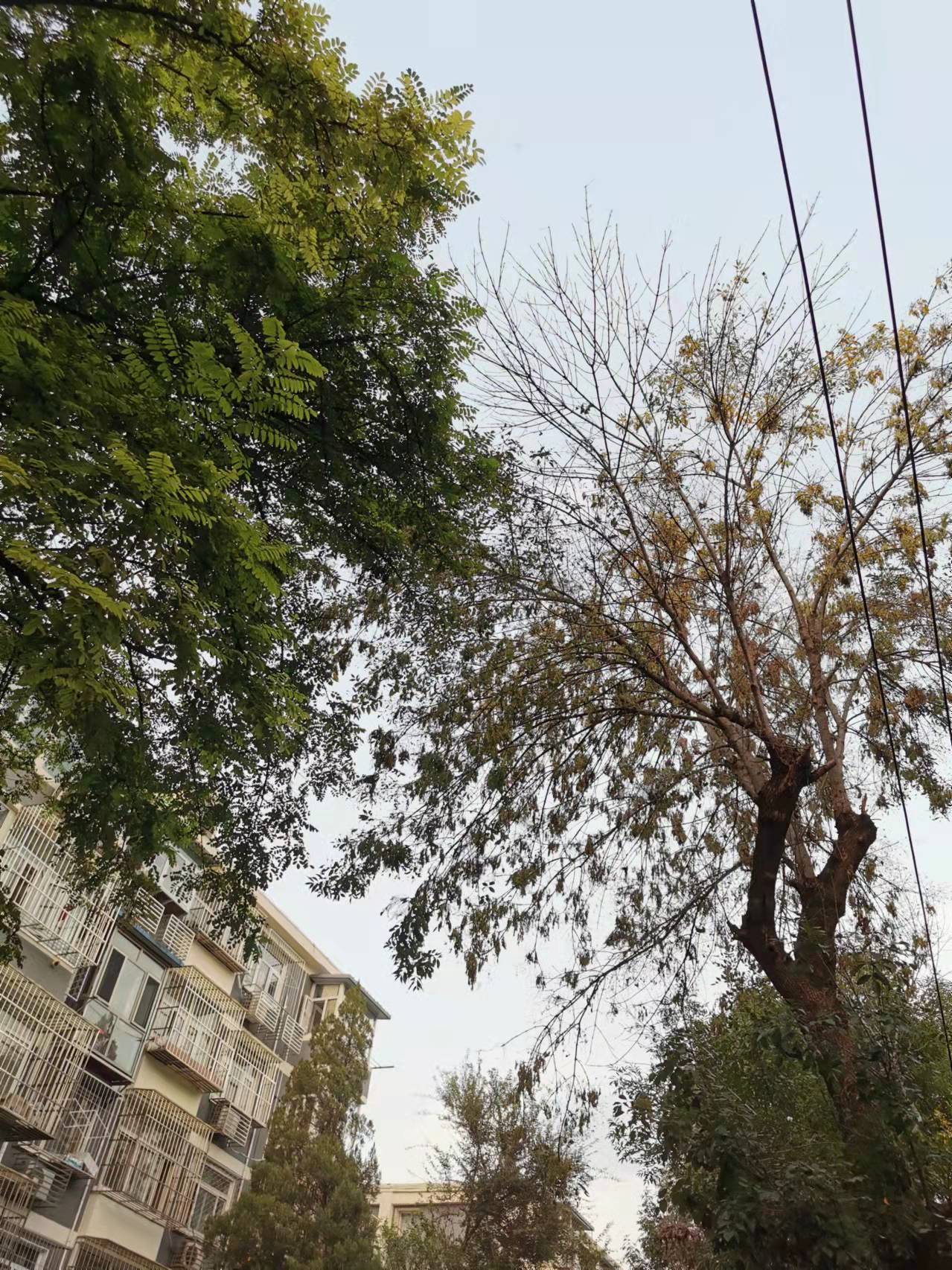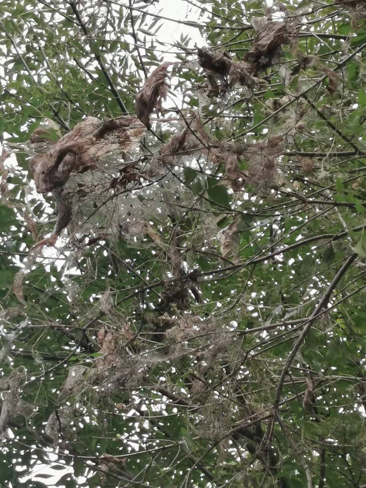 从6号楼北行,是一片碧绿的草地,蚊子追着人叮咬,打掉会再飞上来。草坪南侧的槐树、杨树,大片大片被啃噬。4号楼、5号楼、2号楼……小区里几乎到处可见美国白蛾。