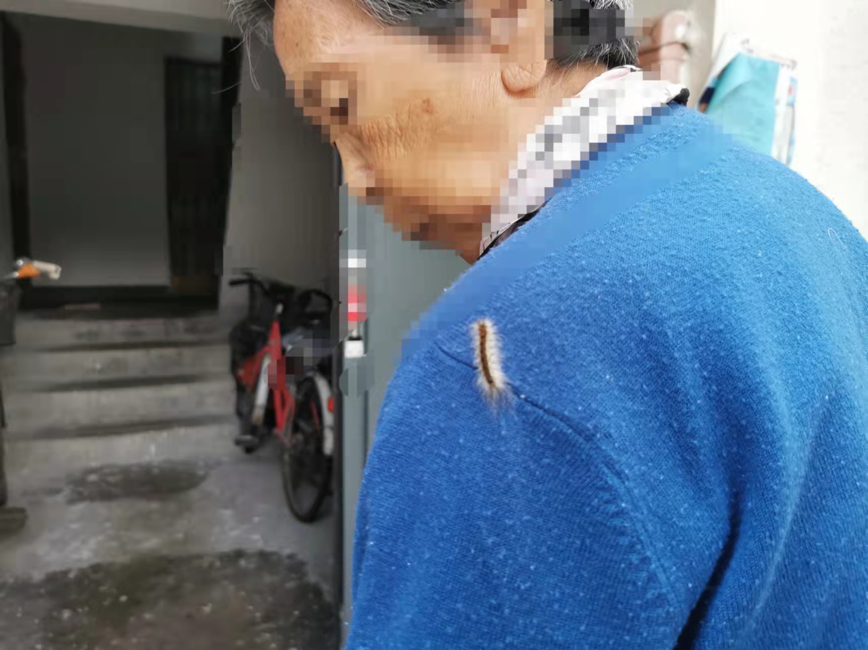 老人说,她住在这里50多年了,从来没看到过这么多的虫。这几天物业也来打药,可因为人工打药消杀范围有限,很难治大树高处的虫子。就在老人扫虫的工夫,一只美国白蛾突然爬到了她肩上,吓得老人大喊,“赶紧帮我打掉。”