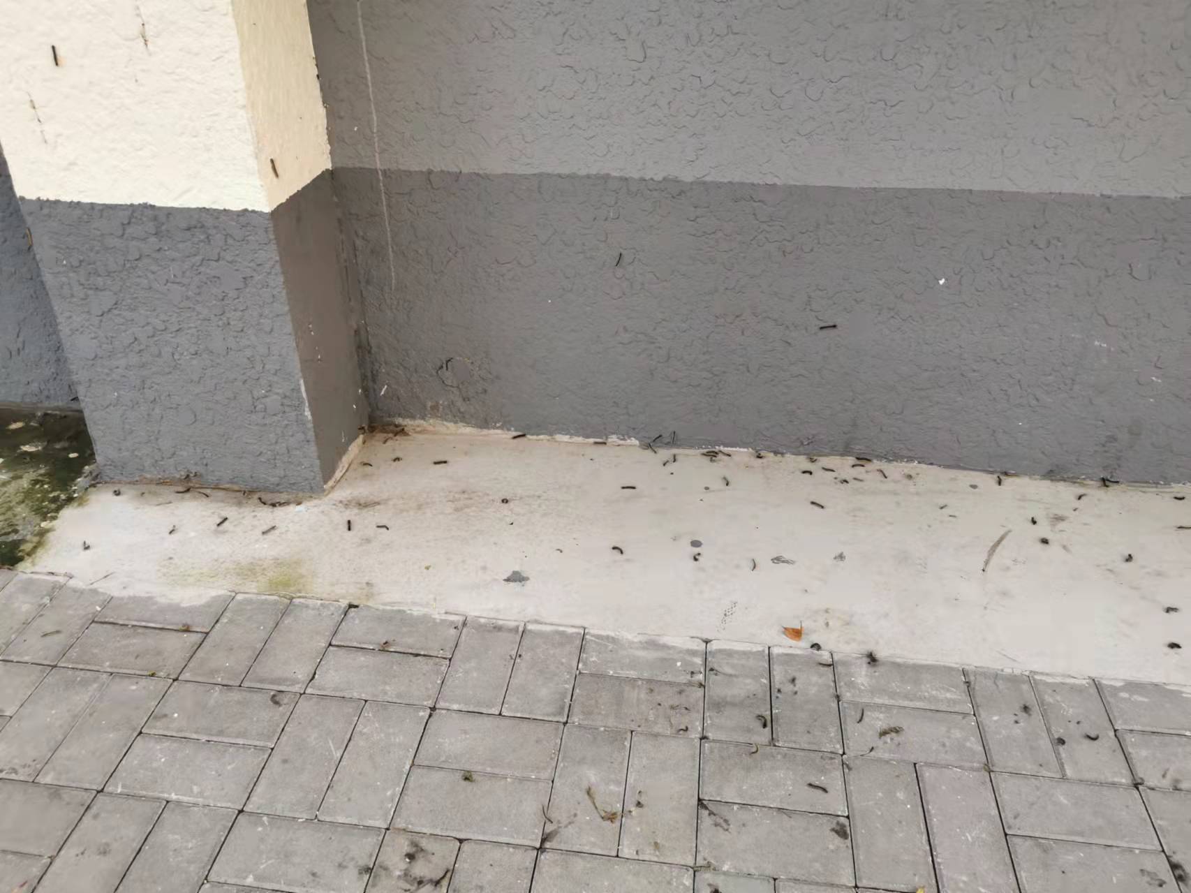 “赶紧请专业人员来消杀吧,物业喷药没用。您看,遍地都是,树上的虫噼噼啪啪地往下掉,地上的叽里咕噜地滚,看着太害怕了。”一位身穿蓝毛衣的老人从家中拿出扫帚,几下就扫出一堆虫,“它们都爬进楼道了,得不断地扫。上次我和一位邻居就在门前这片地儿,扫了半簸箕!”