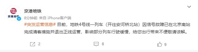目前,地铁4号线一列车(开往安河桥北站)因信号故障已在北京南站完成清客措施并退出正线运营,影响部分列车行驶缓慢,给您出行带来不便敬请谅解。