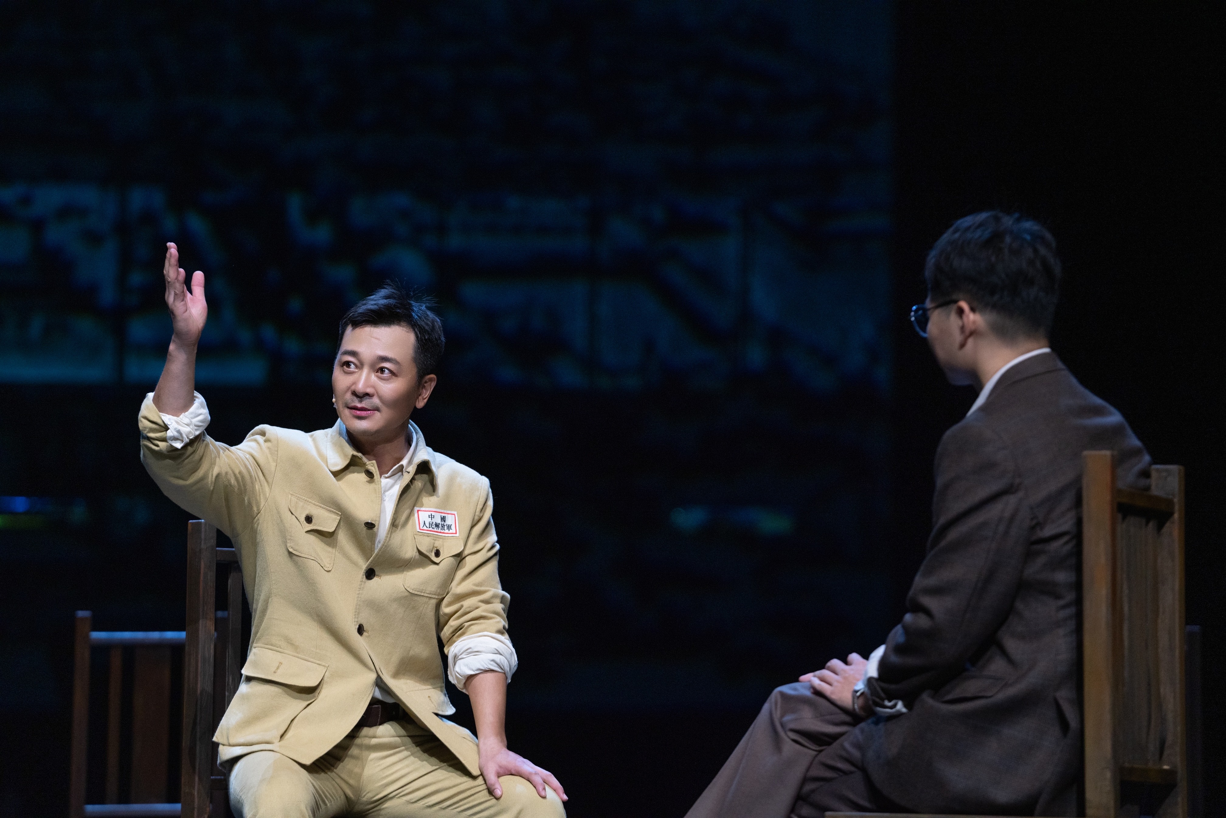“各位听众!今天,北平宣告解放!”“新华社前线22日电……英勇的人民解放军30万人渡过长江!”……舞台上,红黑相间的光影中,隐约出现了北平新华广播电台的工作人员,此起彼伏的男女广播声中,话剧《直播开国大典》拉开帷幕。