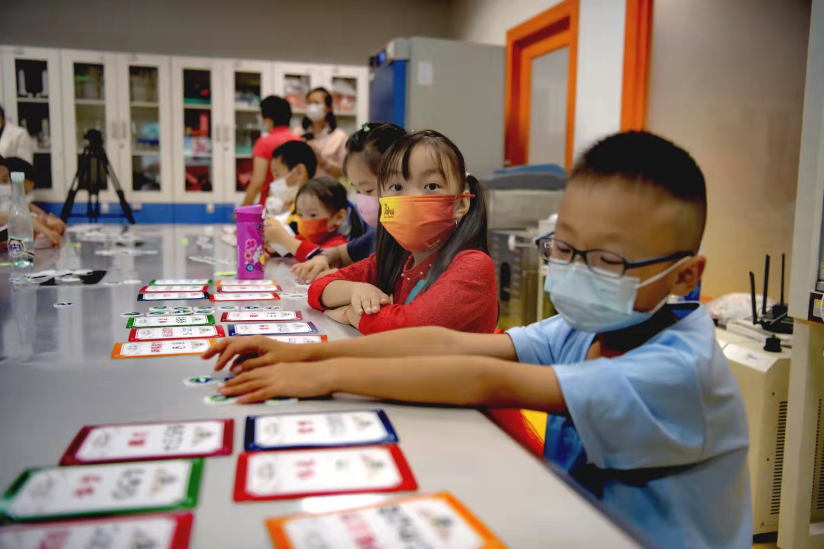 “海底火山喷发,大量气体释放,海洋含氧量大量下降,你手里的生物有生存优势吗”自博三层探索角实验室里,一个问题抛出,回答此起彼伏。“我手上的生物是不耐缺氧型的”“我抽到了鱼鳔高度特化成类似肺的结构”……指导老师说,每位小观众手中有6张卡片,分别代表生物的食性、体长、呼吸能力、适应温度范围、鳞片等特征,通过不同的模拟设计,让他们认识丰富多彩的海洋生物,还有它们高超而又神奇的生存技巧,同时了解这些特点是如何演化形成的。