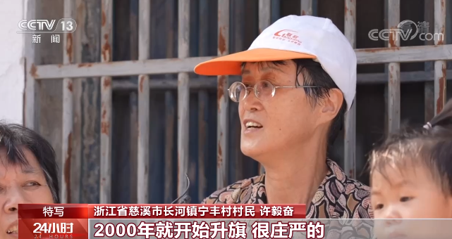 浙江省慈溪市长河镇宁丰村村民 许毅奋:2000年就开始升旗,很庄严的。国庆节本来是要到天安门看升国旗,现在就在这里就能看到庄严的国旗升上去。