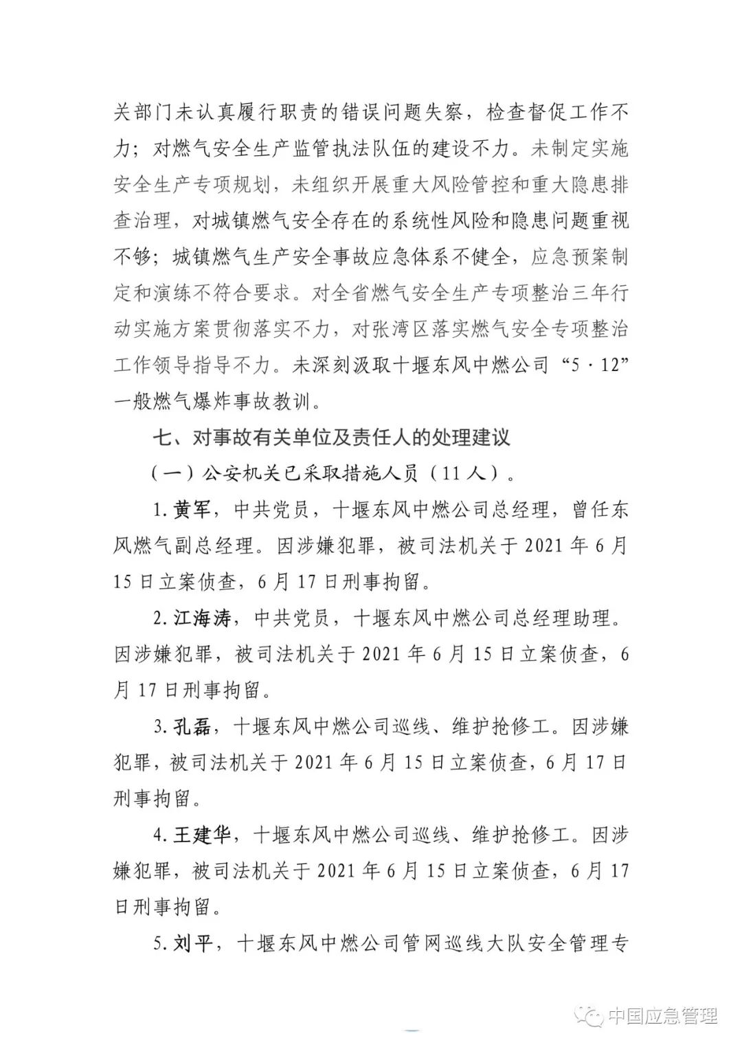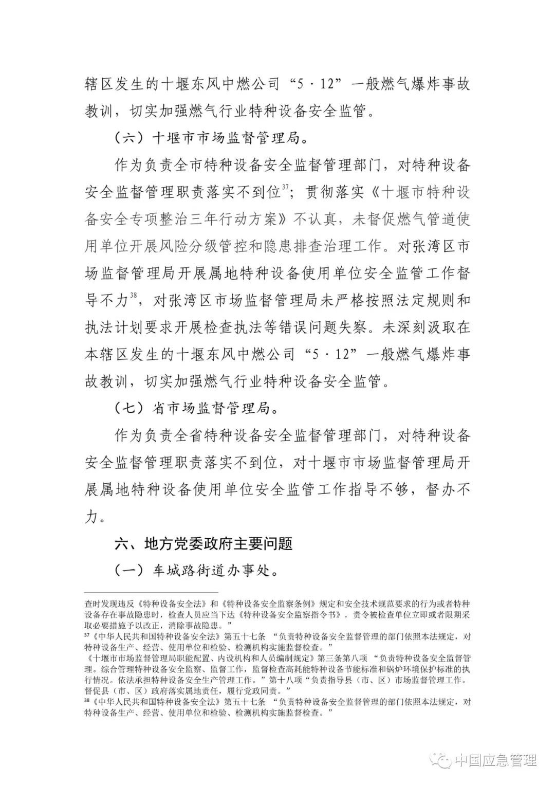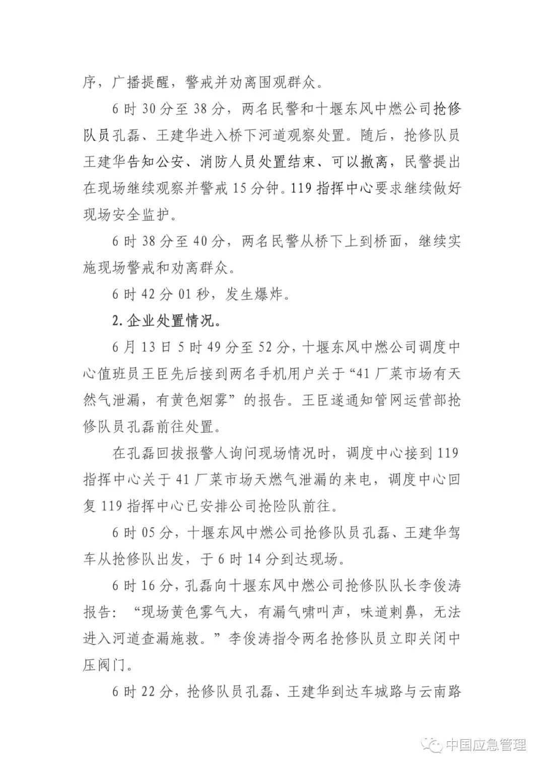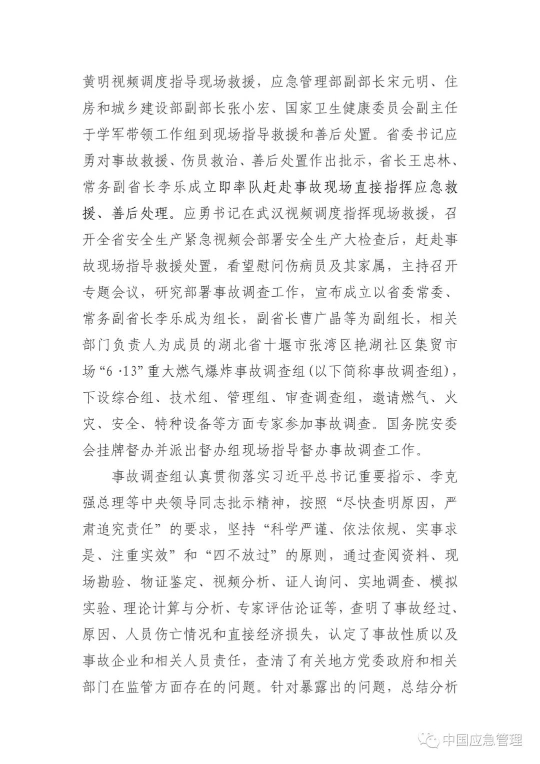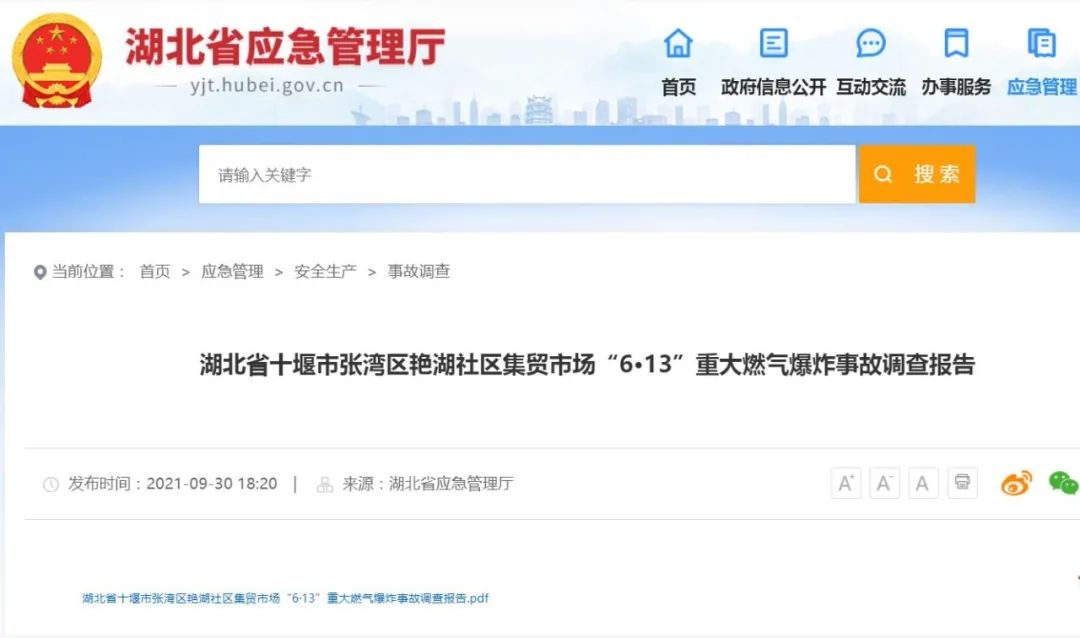 9月30日,湖北省应急管理厅官方网站发布了《湖北省十堰市张湾区艳湖社区集贸市场“6·13”重大燃气爆炸事故调查报告》,事故调查组认定,这起重大燃气爆炸事故是一起重大生产安全责任事故。