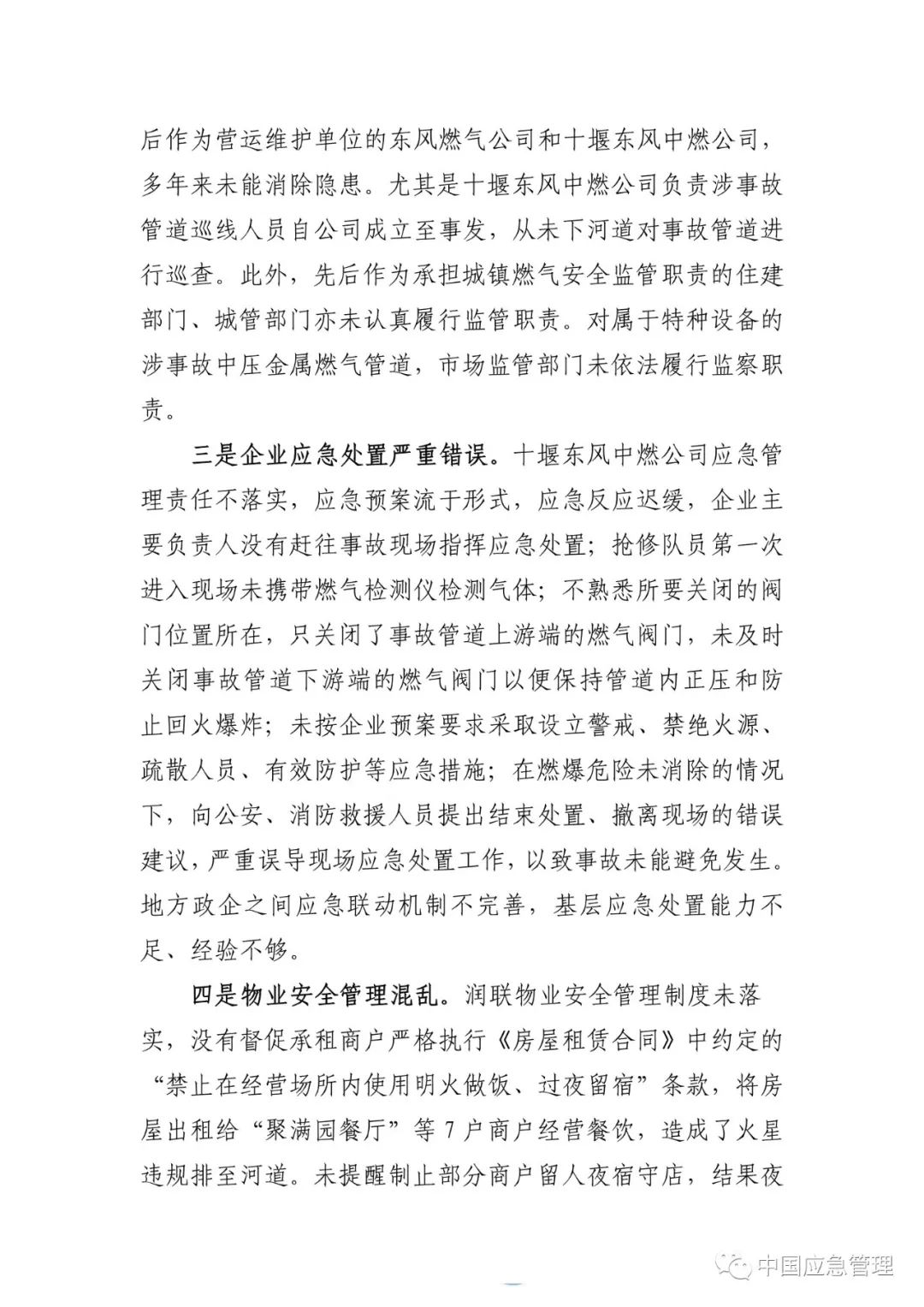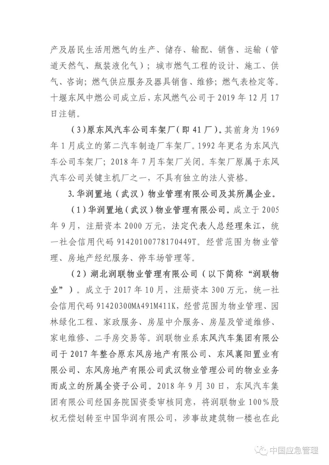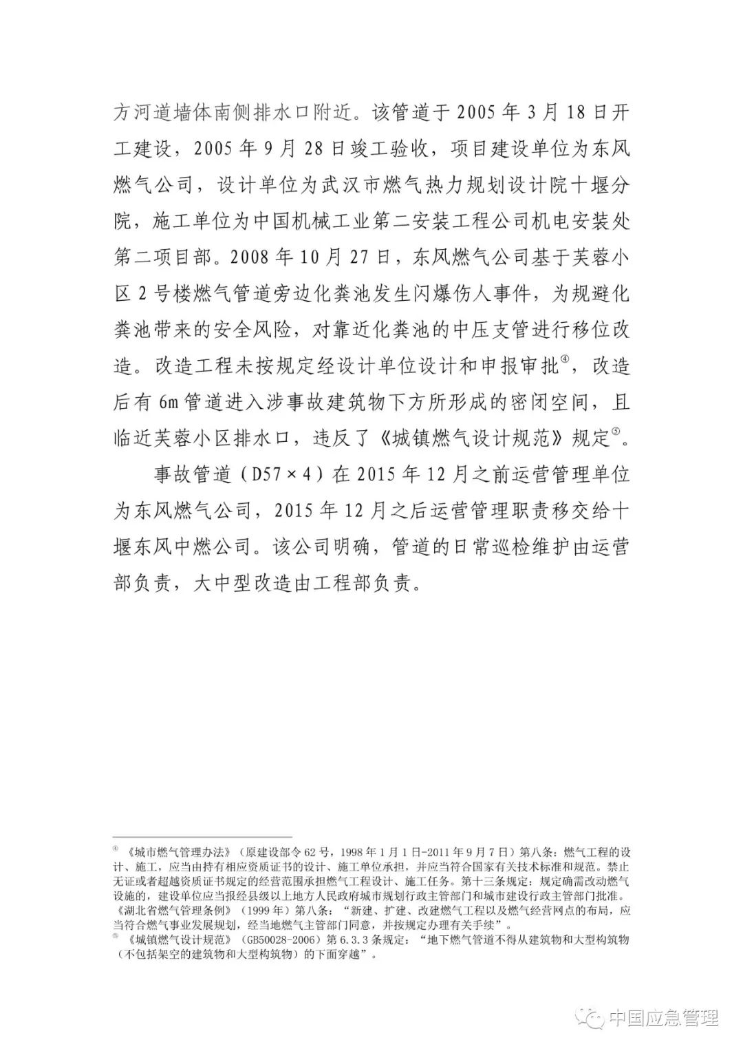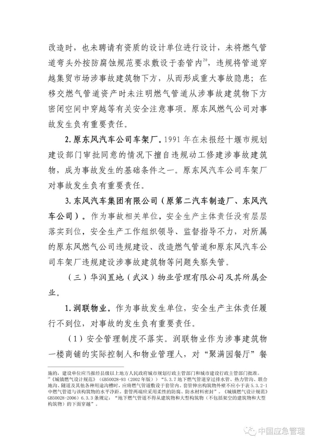 调查报告显示,涉事故建筑物由东风汽车房地产有限公司向润联物业划转时,未提示或告知下方有燃气管道穿过,其中现在负责运营维护事故管道的十堰东风中燃公司,从未对事故管道进行巡查,事发后巡线员为逃避责任追究,伪造补登了巡线记录。