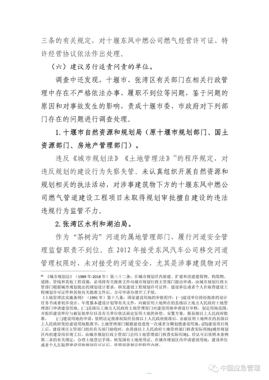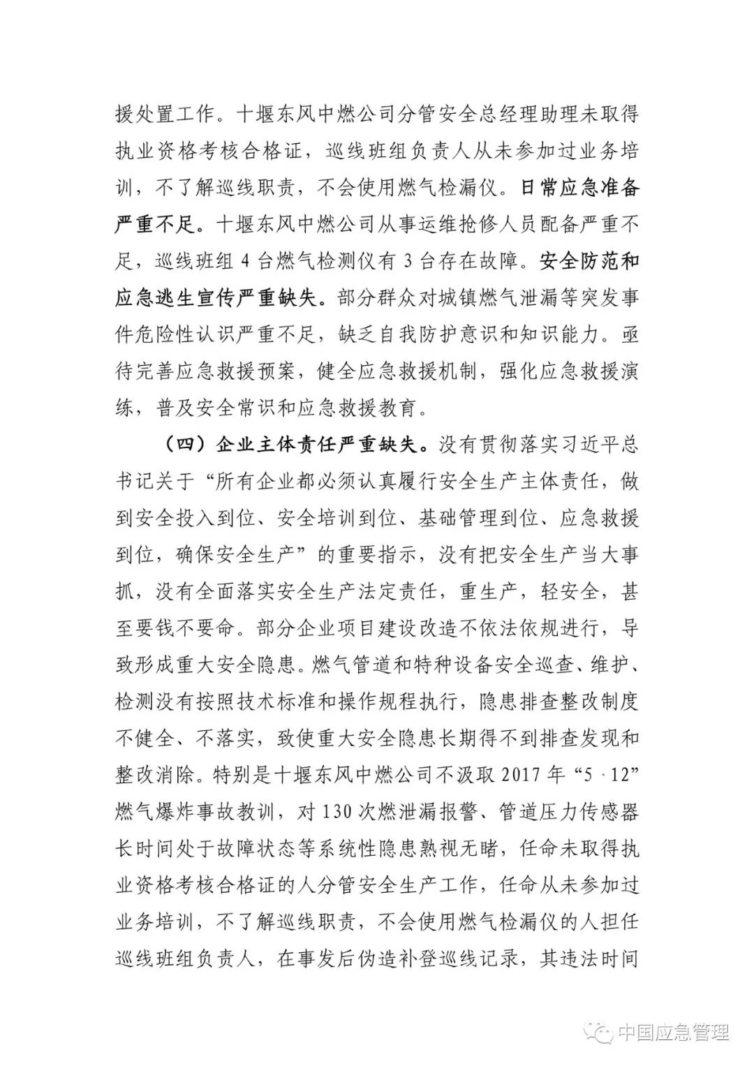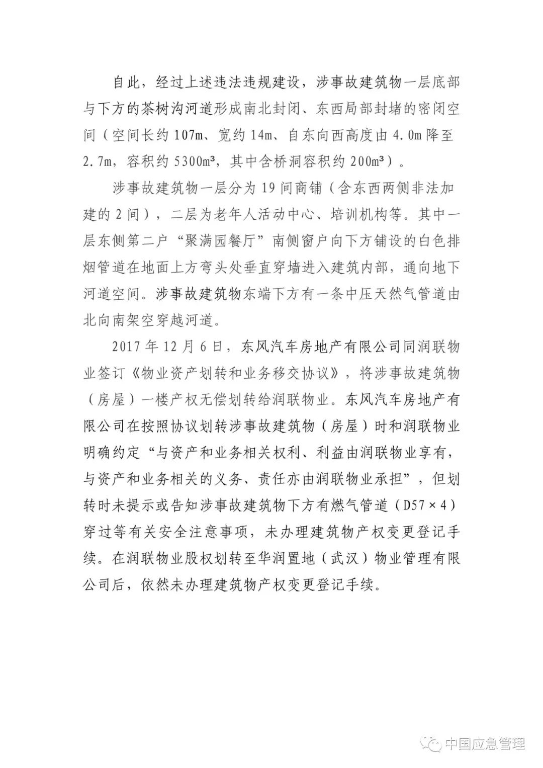 调查报告显示,涉事故建筑物由东风汽车房地产有限公司向润联物业划转时,未提示或告知下方有燃气管道穿过,其中现在负责运营维护事故管道的十堰东风中燃公司,从未对事故管道进行巡查,事发后巡线员为逃避责任追究,伪造补登了巡线记录。