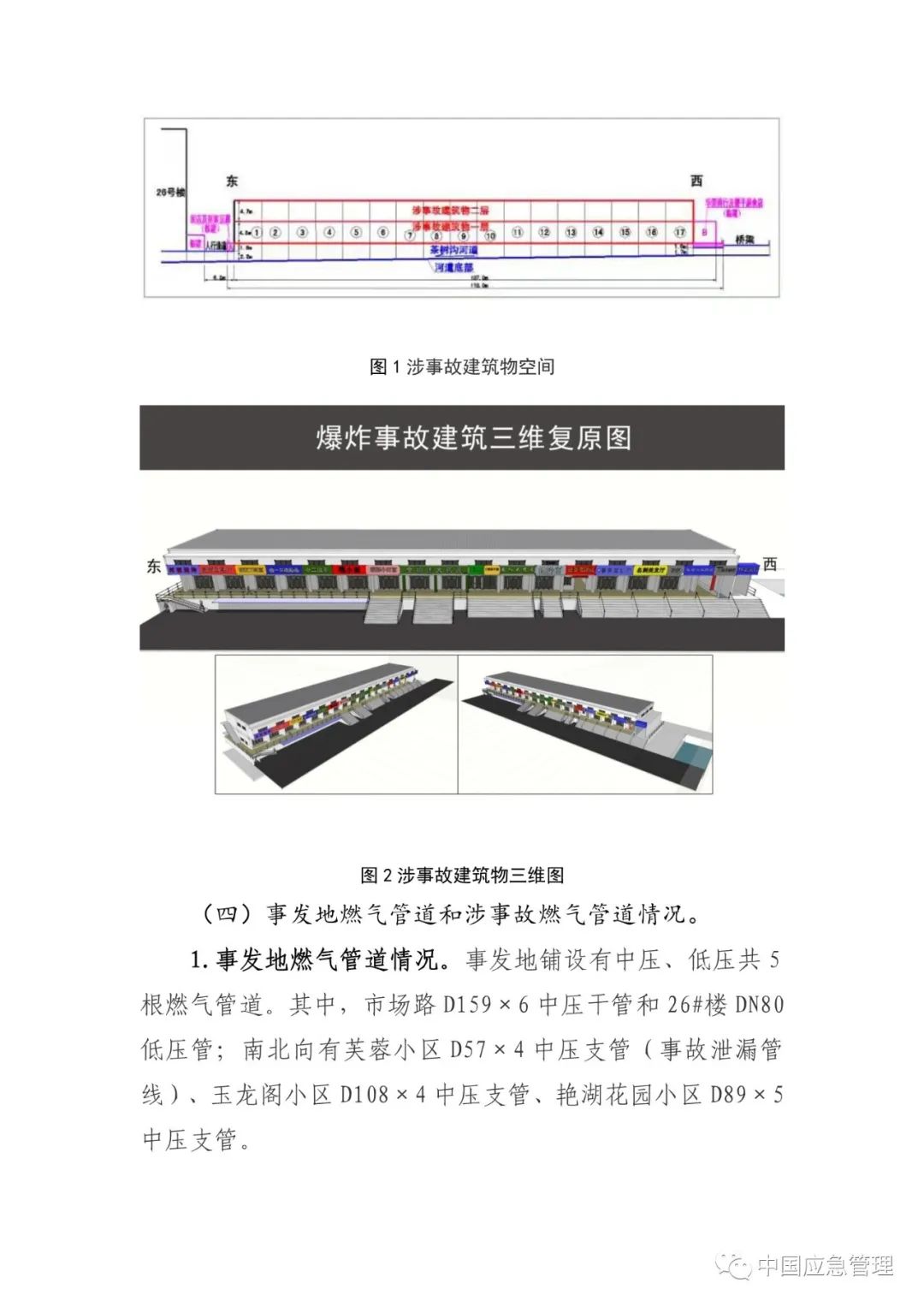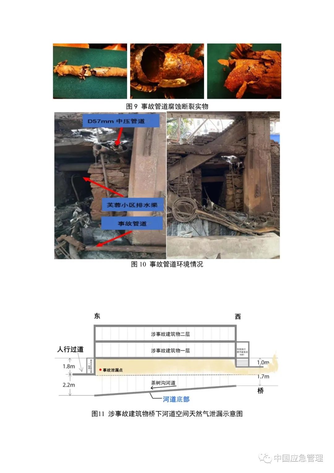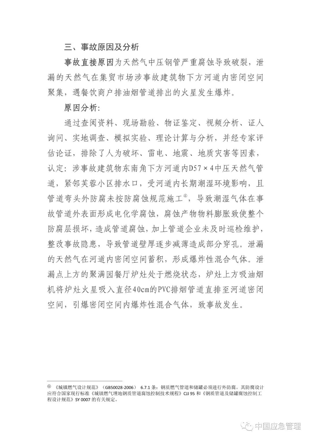 事故直接原因为天然气中压钢管严重锈蚀破裂,泄漏的天然气在建筑物下方河道内密闭空间聚集,遇餐饮商户排油烟管道排出的火星发生爆炸。