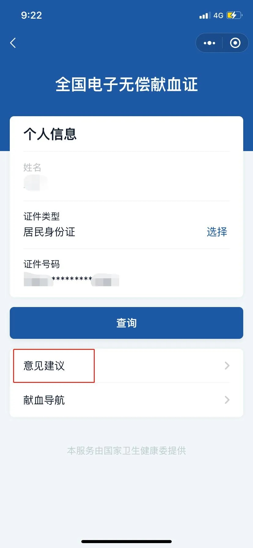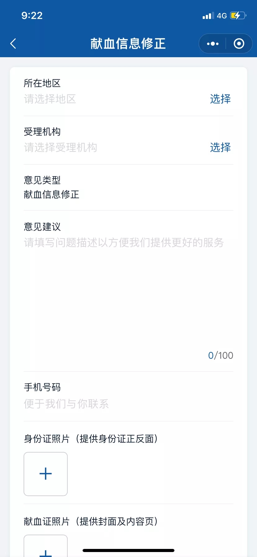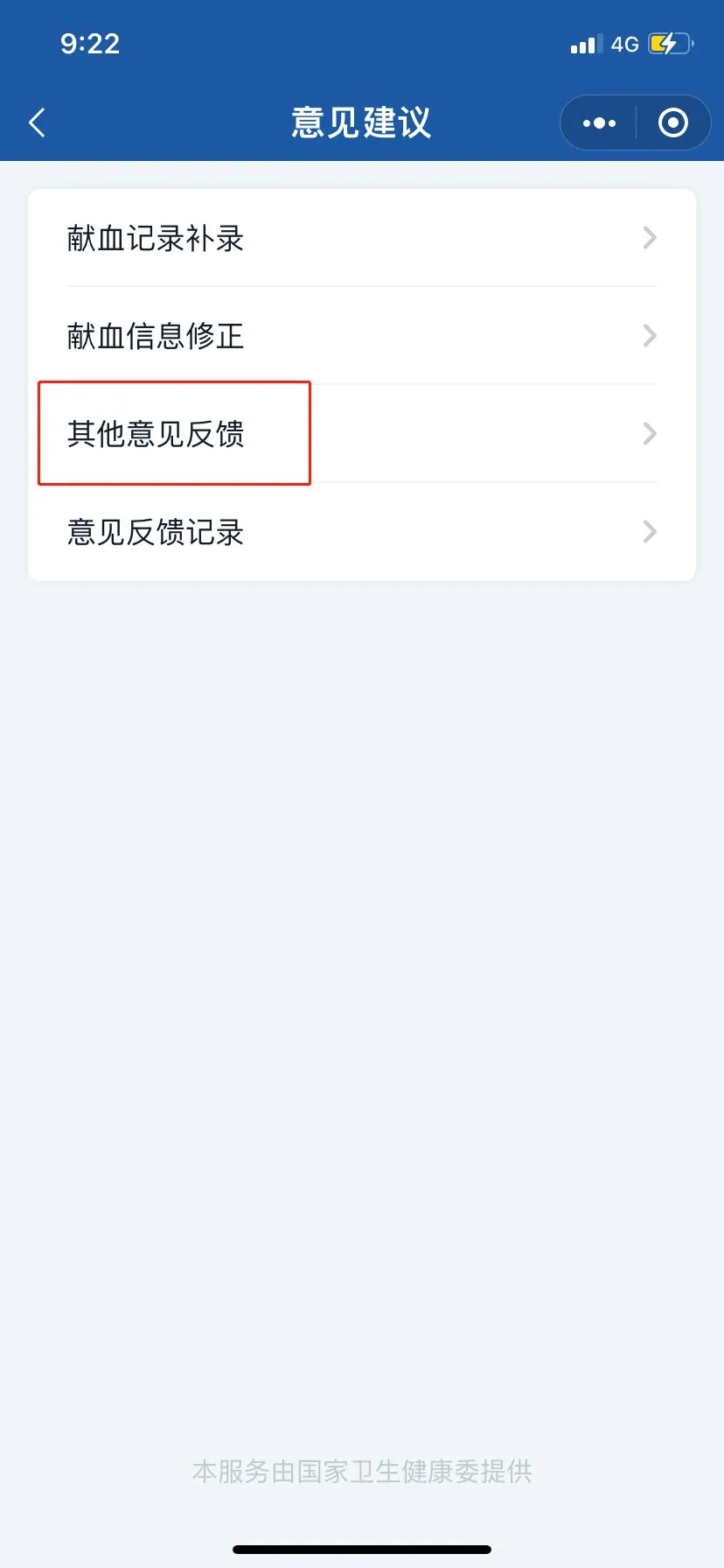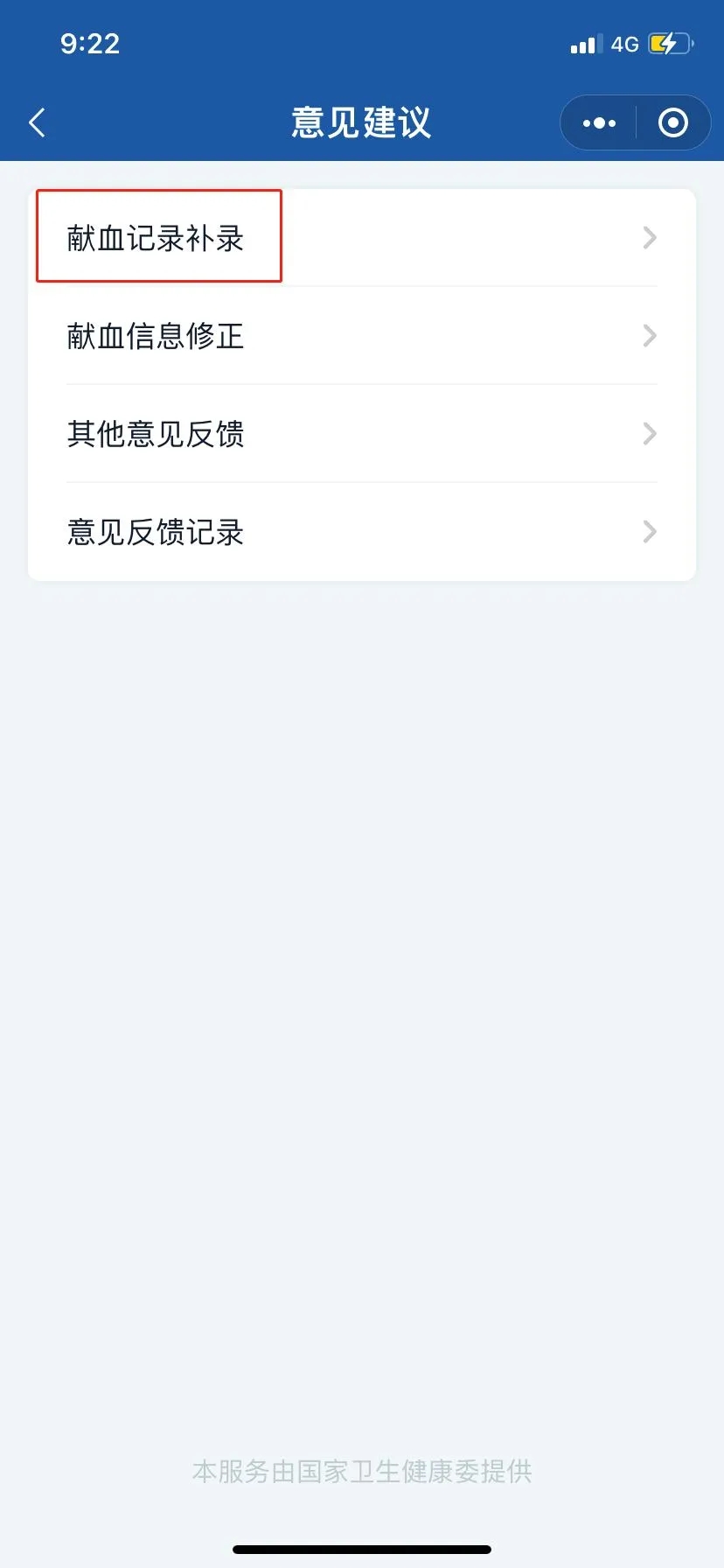 在“意见建议”中点击【献血记录补录】,输入“所在地区”、“受理机构”、“手机号码”、“身份证照片”、“献血证照片”等信息,提交审核通过后即可补录献血记录。
