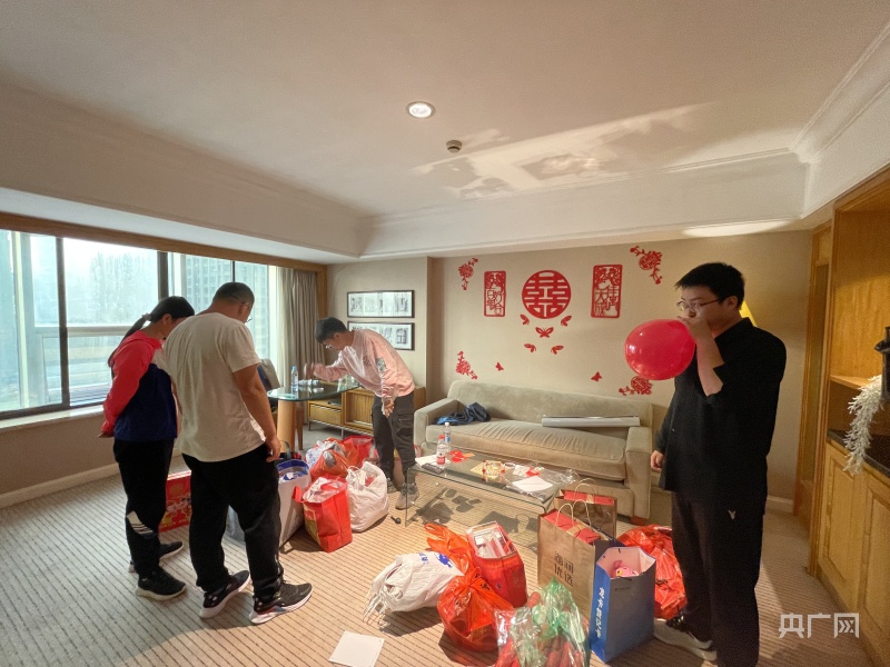 婚礼前一天,新郎大同(中)和好友们一起亲手布置婚房(总台央广记者 韩雪莹 摄)