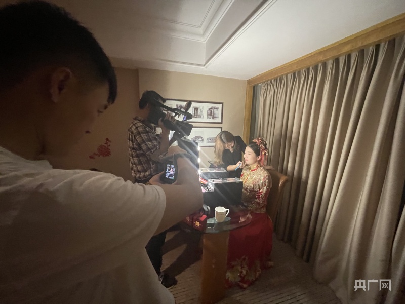 凌晨3:30的新娘婚房里,阿娇已经开始上妆(总台央广记者 韩雪莹 摄)