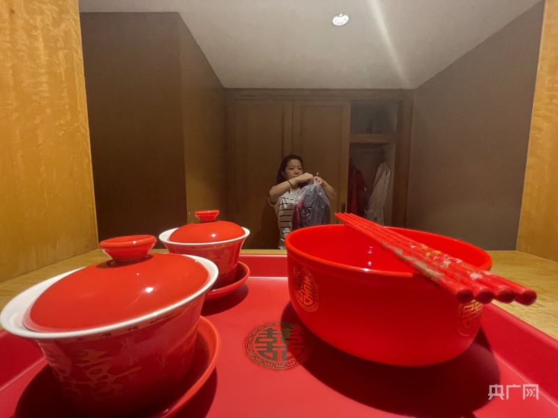 阿娇妈妈在酒店婚房的衣帽间整理婚礼当天要穿的“盛装”(总台央广记者 韩雪莹 摄)