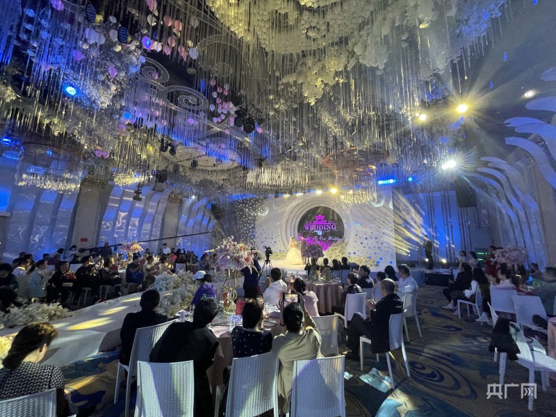 一首甜蜜温婉的情歌后,阿娇和大同在舞台上交换对戒,共同开启了这场温馨浪漫的典礼(总台央广记者 韩雪莹 摄)