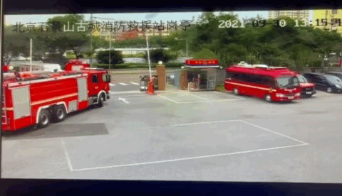 古城消防救援站,立即出动一辆消防车在门口等候,该货车司机将车开入消防站院内。