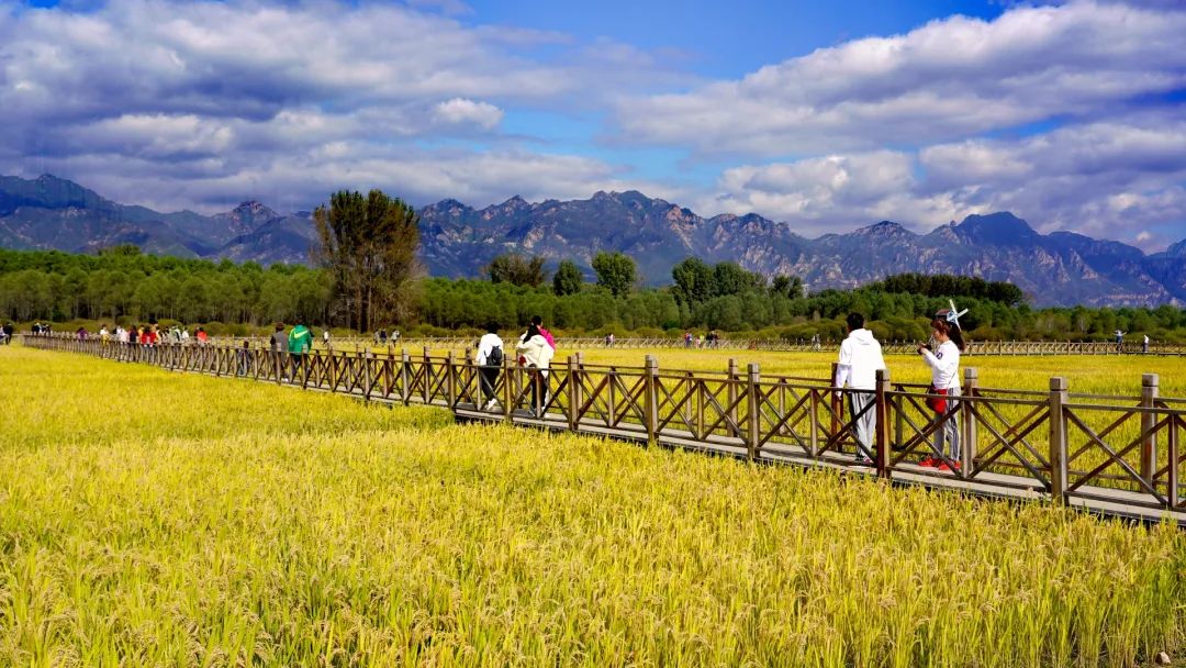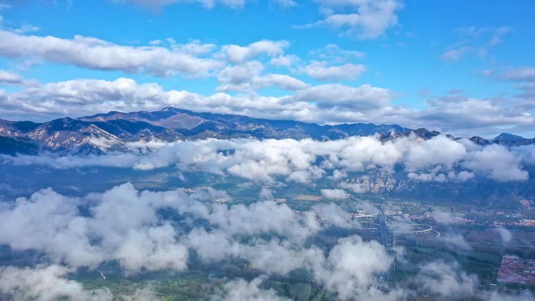 云雾在空中嬉戏,时而化作长长的绫罗,时而融入湛蓝的天空中,一抬头便是澄澈的蓝天。云海绵绵,在蓝天白云的映衬下,最美冬奥城多了几分别样的色彩。