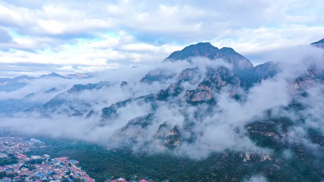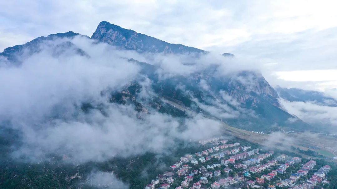 从天空俯瞰,云雾飘浮在山腰间,“海陀戴雪”在如梦似幻的云海中若隐若现。