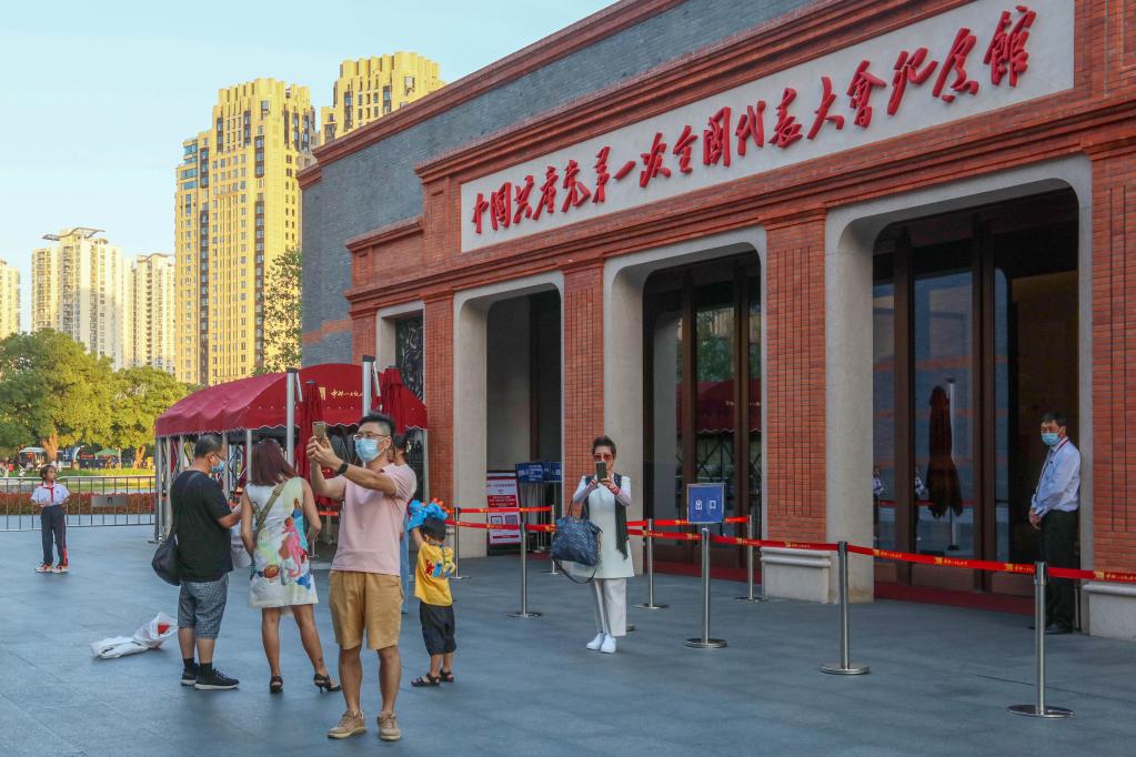 2021年10月3日,人们在中共一大纪念馆前拍照留影,新华社记者 王翔 摄