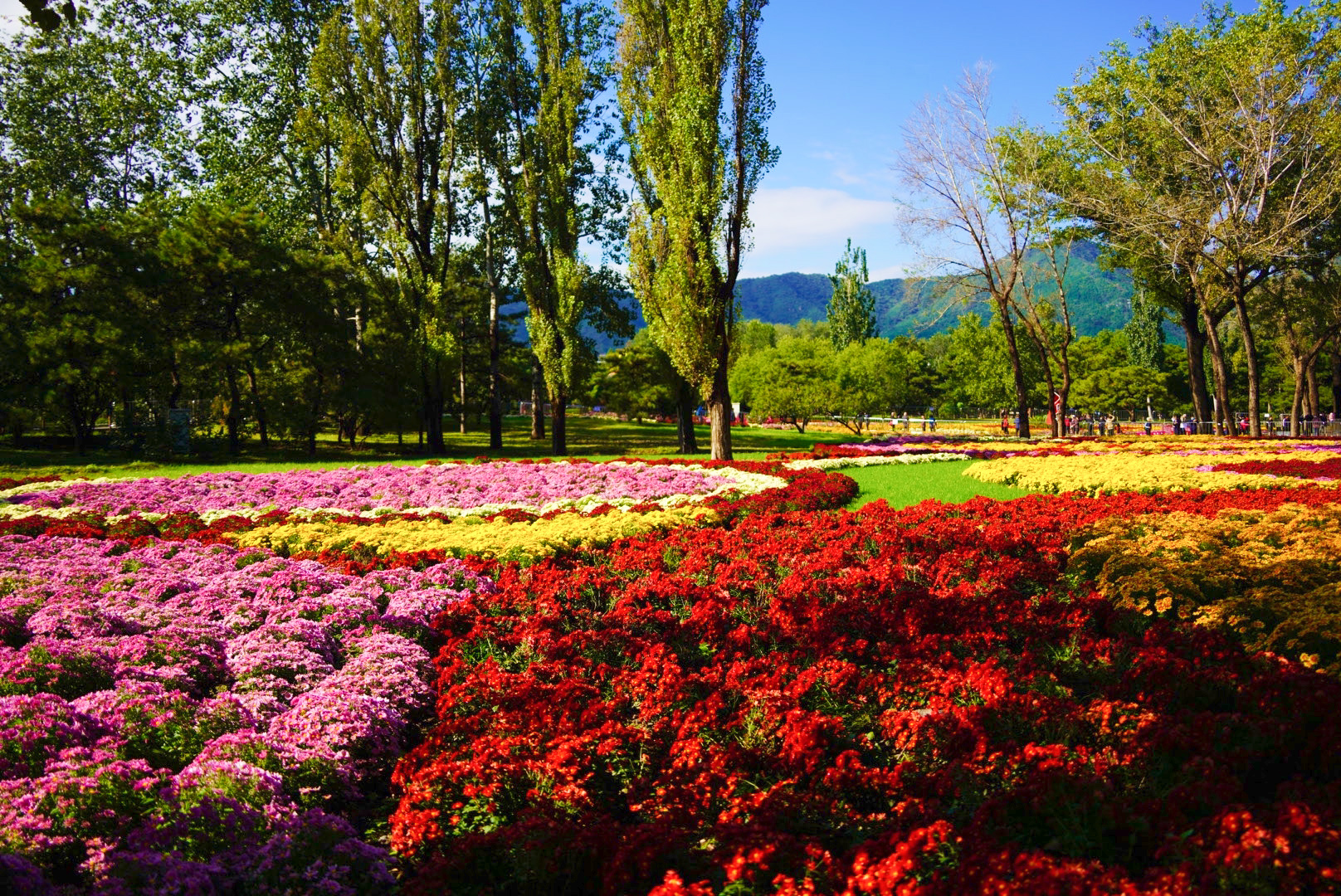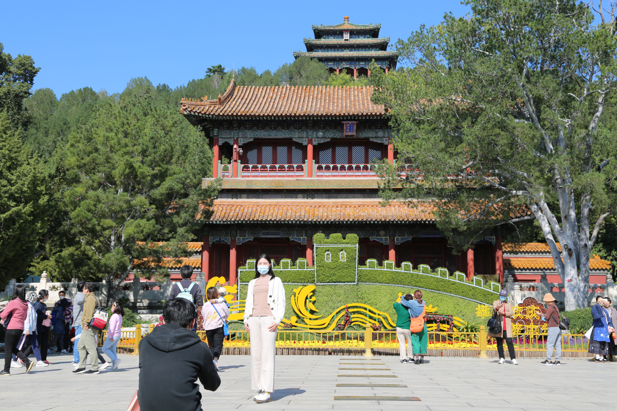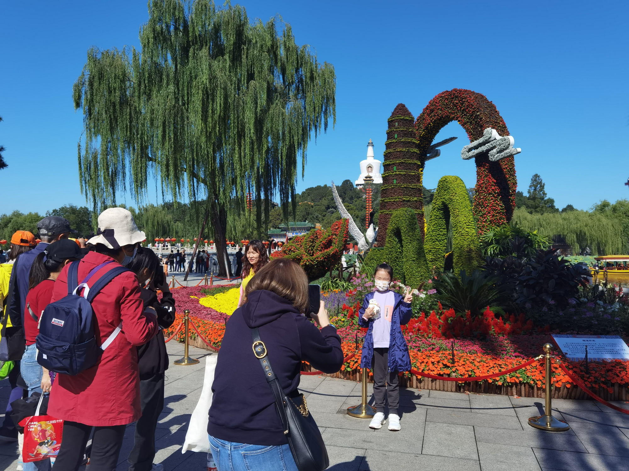 北海、景山、中山、北京植物园等花团锦簇,一座座国庆主题花坛与秋季百余万鲜花全面绽放,吸引各界游客泛舟湖上、登高赏秋。