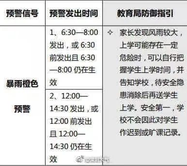 暴雨橙色预警在12:00-14:30发布或生效时,学生家长发现风雨较大,上学可能存在一定危险时,可自行把握学生上学时间;并告知学校,待安全隐患消除后再送学生上学。