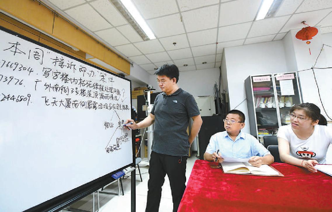 东花市街道干部李海涛在广渠门外南里社区与同事一起商讨当周接诉即办案件的处理情况。 本报记者 和冠欣摄