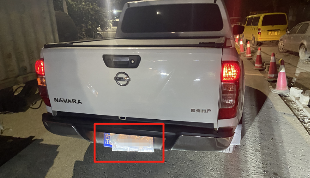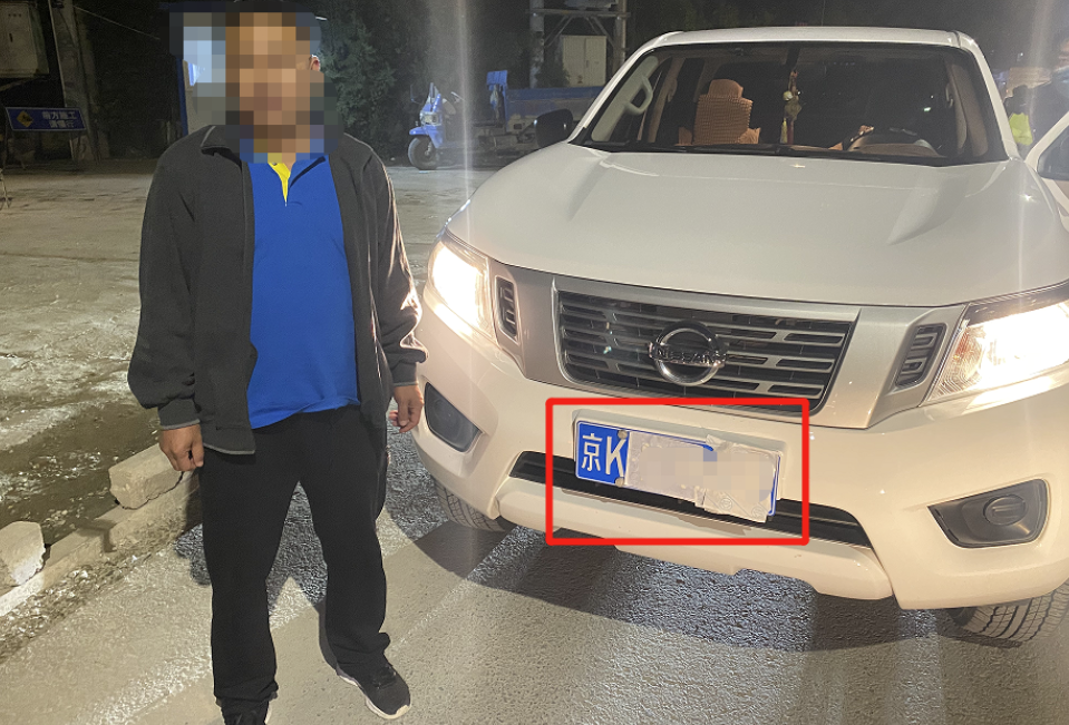 8日晚上8点多,在昌平区小汤山镇大东流村口,昌平交通支队高速路大队一个执法小分队在开展夜查整治工作,一辆皮卡因违反禁行标志被交警拦停。车正要靠边停车,民警在灯光下看到,车前后车牌均被白纸蒙住。