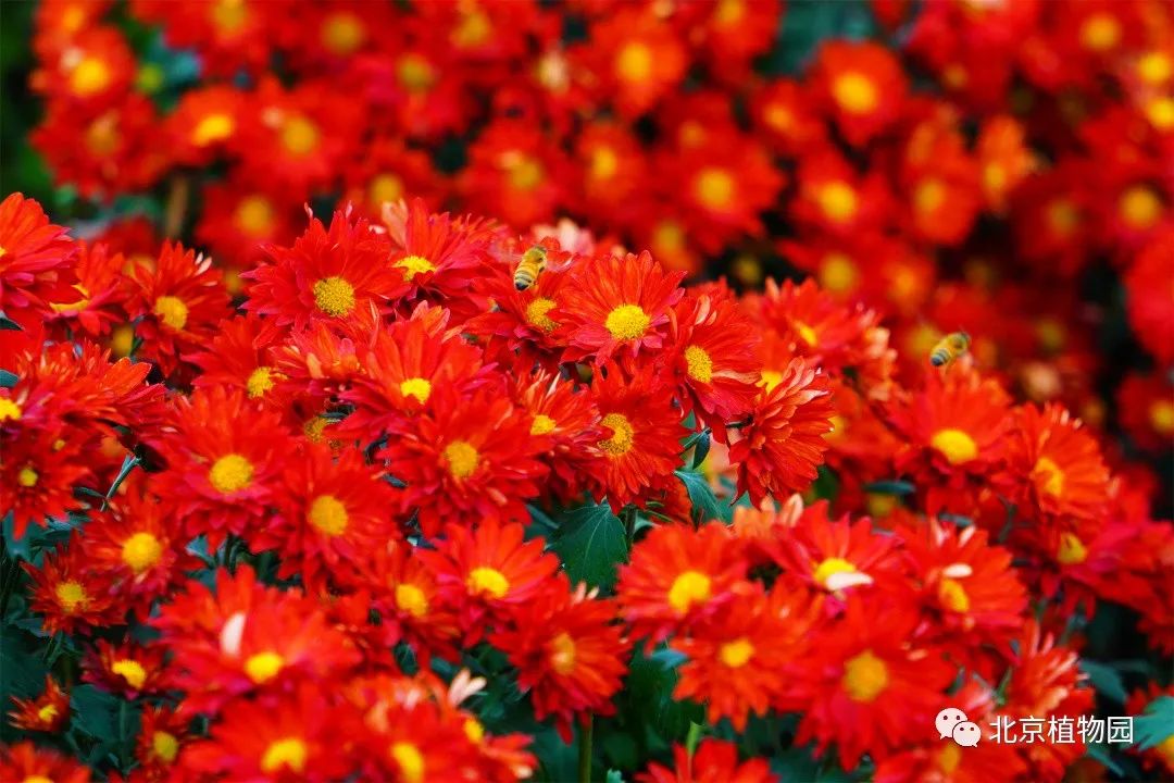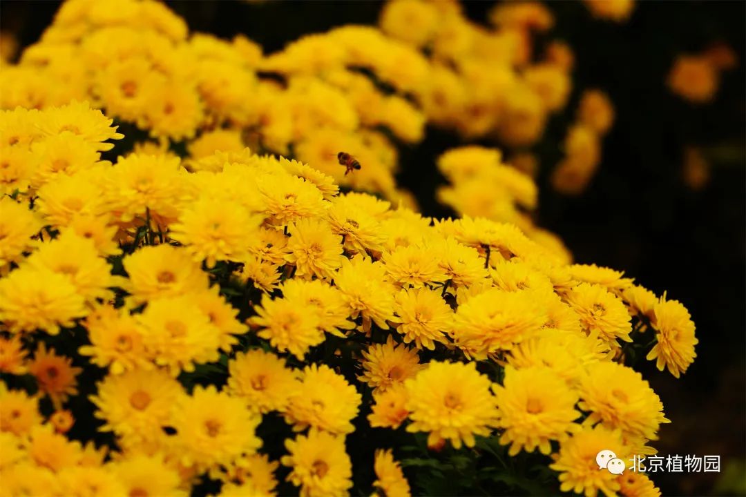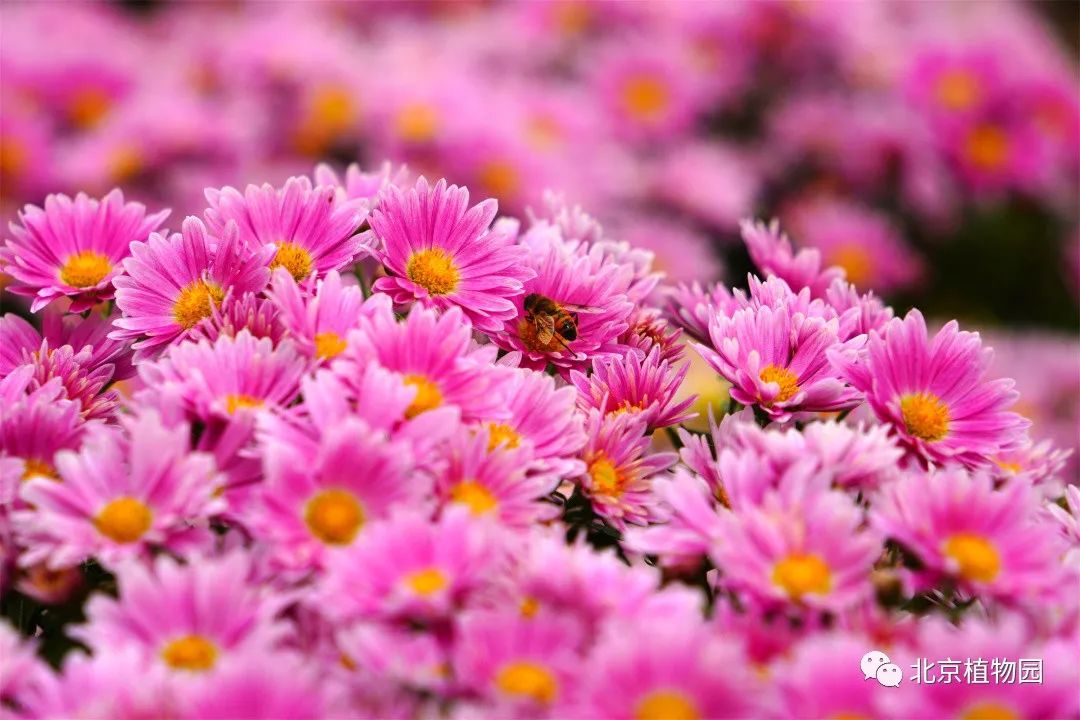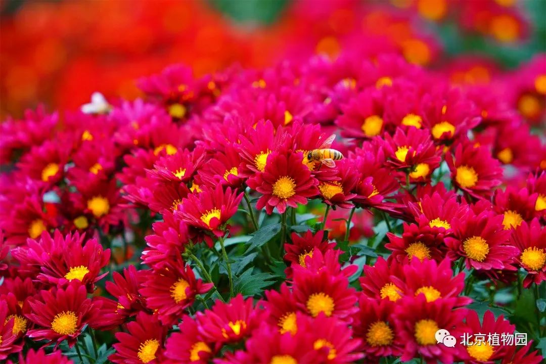 如此优美的景观也是得益于小菊丰富的花色,赤橙黄粉白应有尽有,展现其不同魅力。凑近细看,一只只忙碌的小蜜蜂正在花间采蜜,为这秋日美景增添勃勃生机。
