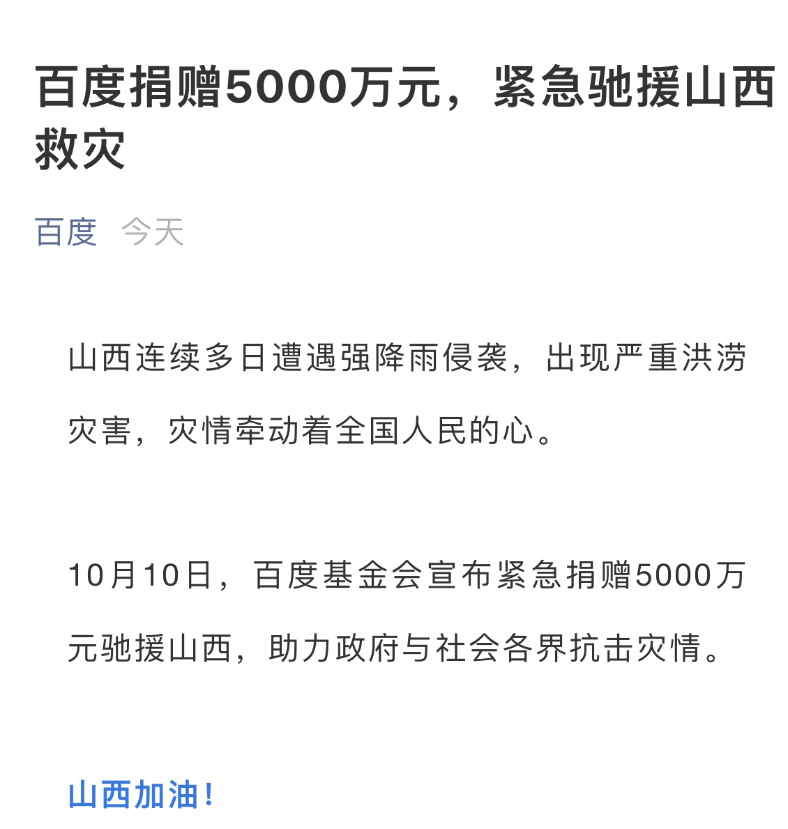 山西连续多日遭遇强降雨侵袭,出现严重洪涝灾害,灾情牵动着全国人民的心。10月9日,国家减灾委、应急管理部针对山西近期洪涝灾害,启动了国家Ⅳ级救灾应急响应。10月10日,拼多多宣布捐赠5000万元,紧急驰援山西救灾。此前,百度基金会也在当日宣布紧急捐赠5000万元驰援山西,助力政府与社会各界抗击灾情。同日,腾讯公益慈善基金会宣布先期捐赠5000万元。