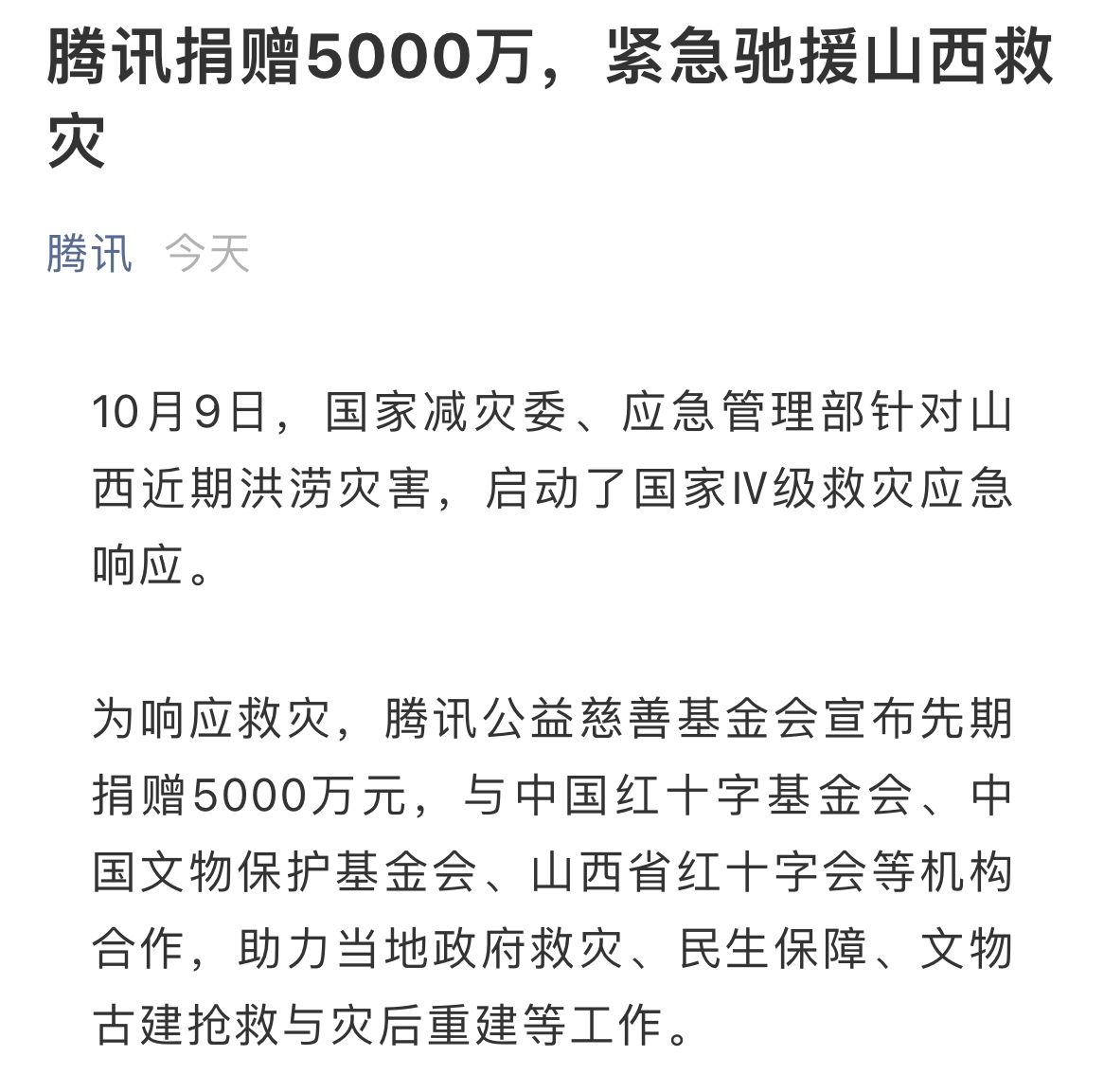 腾讯方面称,为响应救灾,腾讯公益慈善基金会宣布先期捐赠5000万元,与中国红十字基金会、中国文物保护基金会、山西省红十字会等机构合作,助力当地政府救灾、民生保障、文物古建抢救与灾后重建等工作。