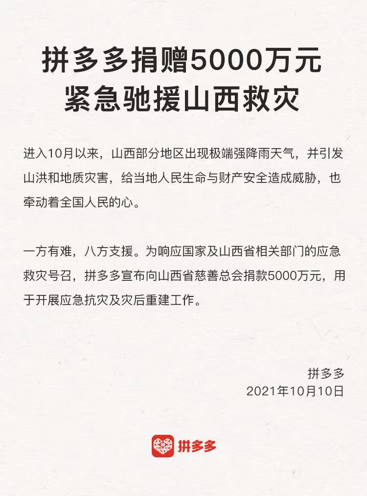 一方有难,八方支援。拼多多方面称,为响应国家及山西省相关部门的应急救灾号召,拼多多向山西省慈善总会捐款5000万元,用于开展应急抗灾及灾后重建工作。