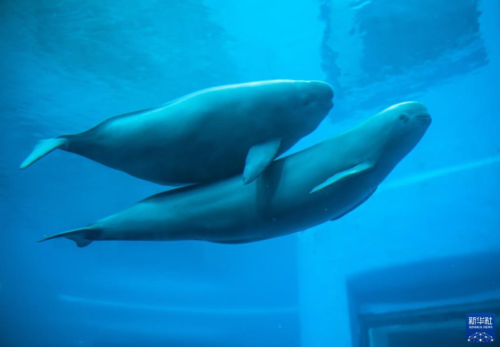 2021年7月5日,在位于武汉的中国科学院水生生物研究所,长江江豚妈妈和小江豚在水中游动。新华社记者 肖艺九 摄