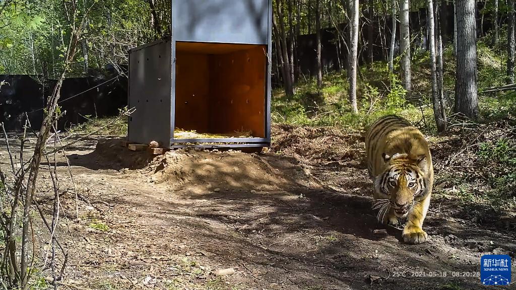 2021年5月18日,在黑龙江省穆棱林业局有限公司林场,之前在密山市获得成功救护的野生东北虎从铁箱子里走出,回归自然(视频截图)。新华社发