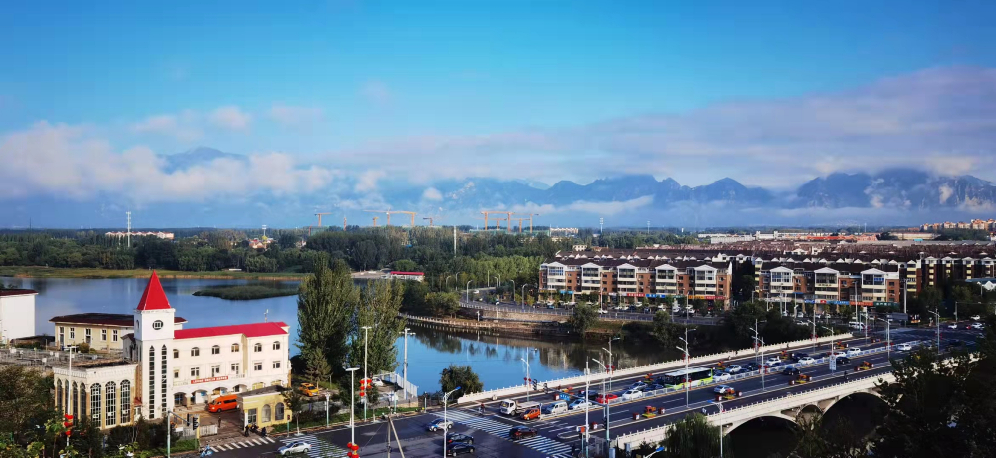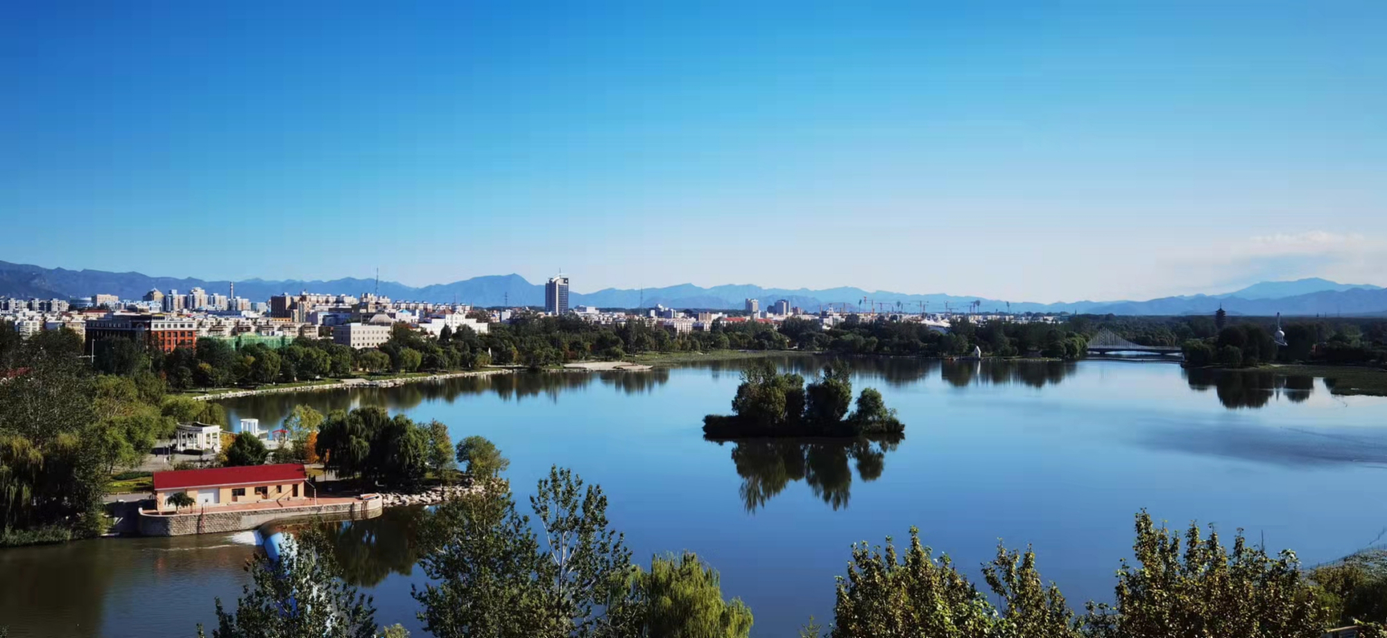 天空湛蓝,白云缥缈,京北延庆群峰俊秀,海陀逶迤,水清岸绿,山水与蓝天交相辉映,宛若有一只奇妙的画笔,绘出最美冬奥城美丽画卷。
