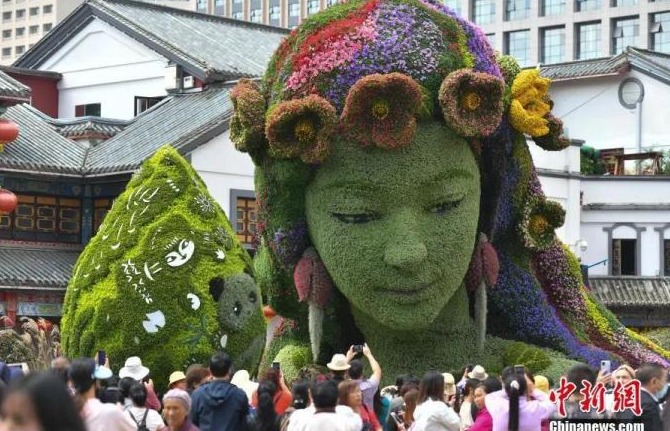 近日,昆明街头为迎接COP15而打造的立体花坛吸引市民打卡。中新社记者 刘冉阳 摄