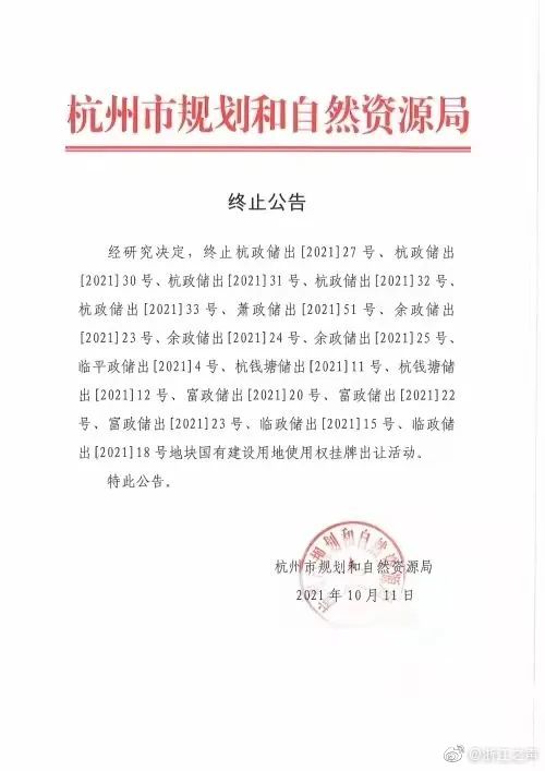 10月11日晚间,杭州市规划和自然资源局发布了杭州第二次土拍的“终止公告”,终止了17宗地块的挂牌出让活动。