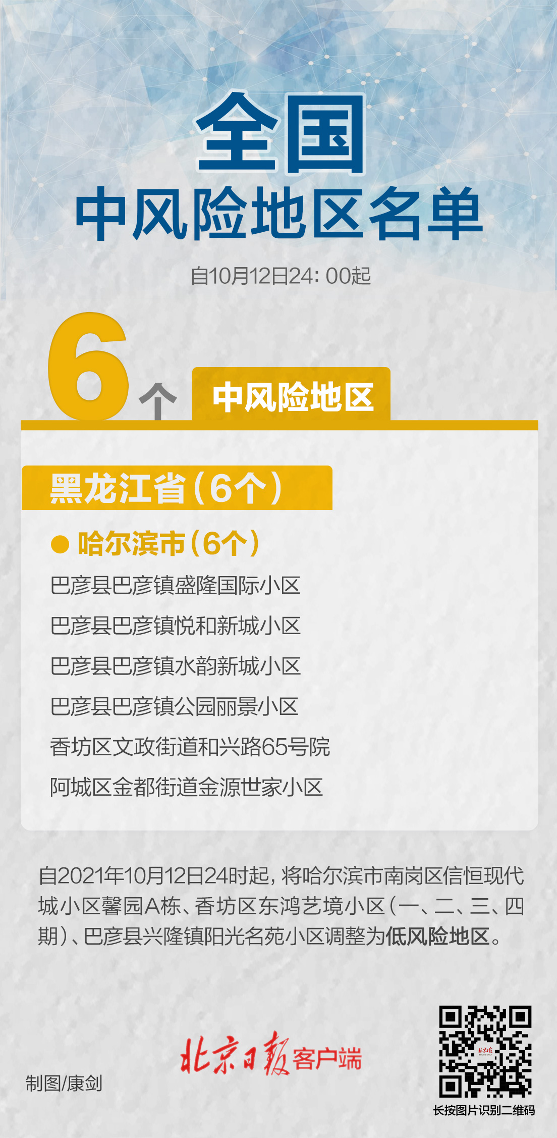 届时,全国高风险区为零,中风险区还有6个,均在黑龙江省哈尔滨市。
