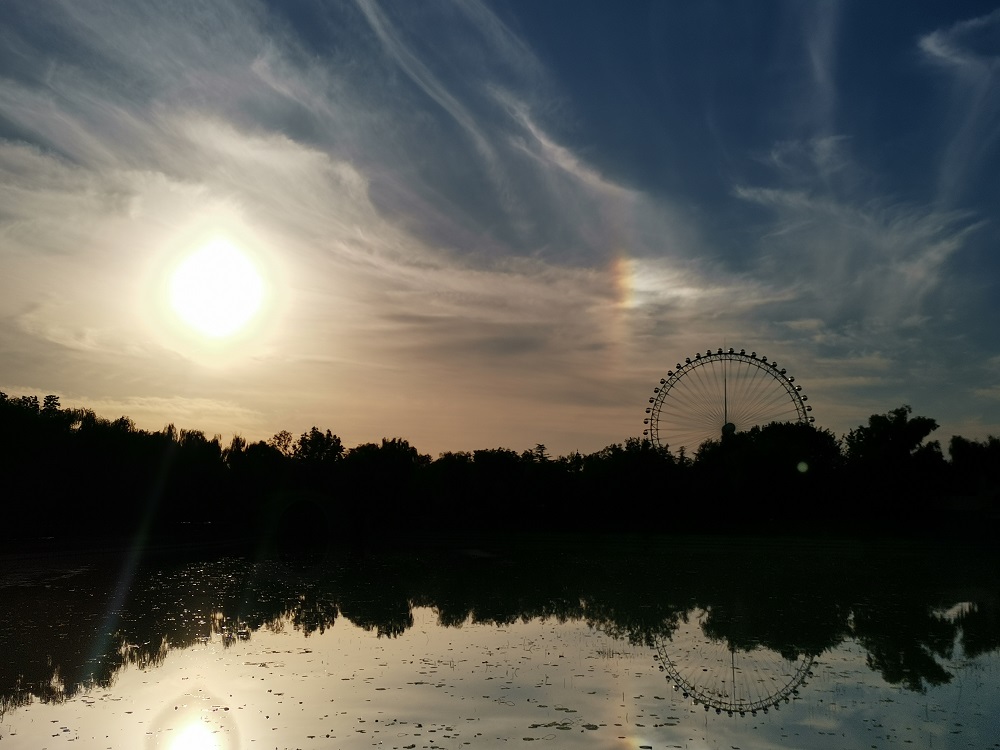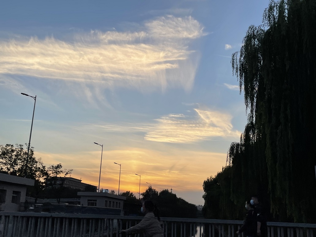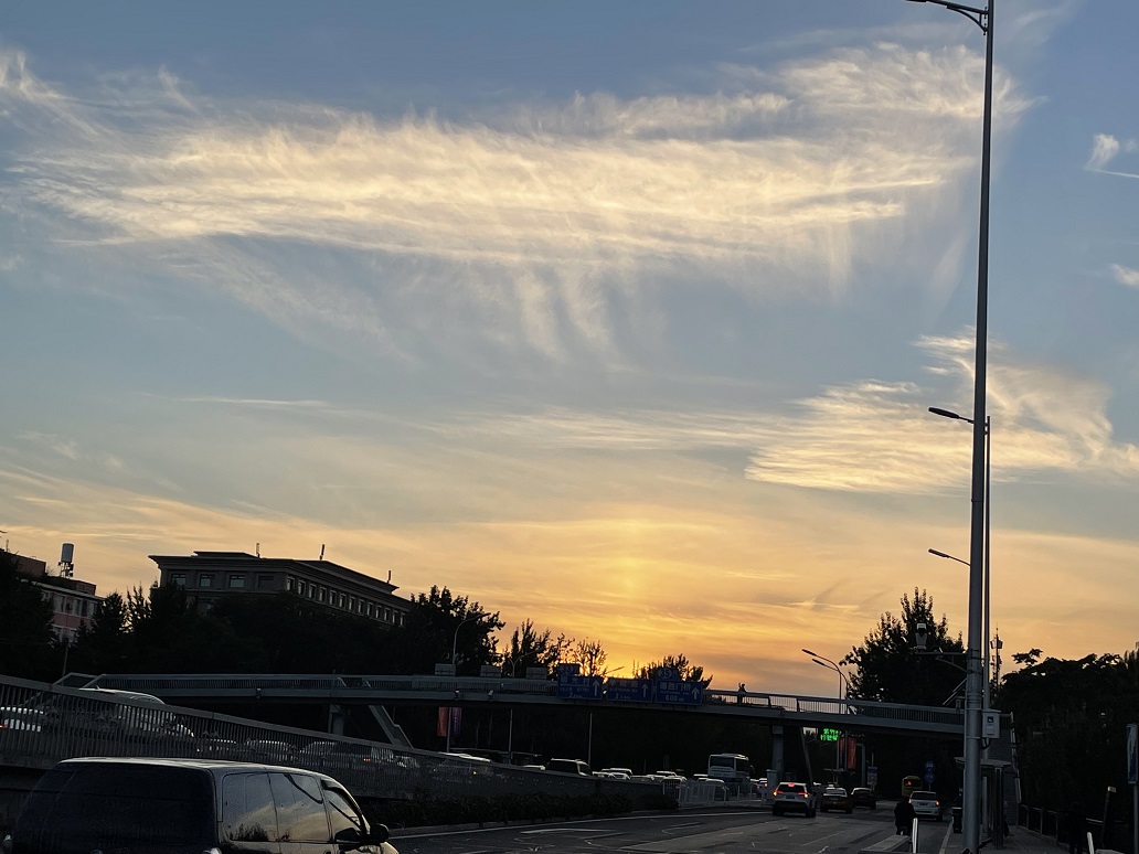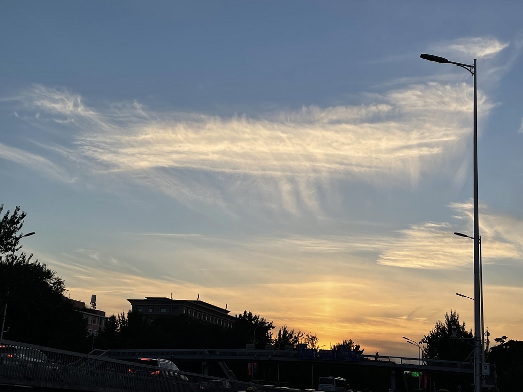 今天傍晚,北京蓝天出现毛卷云,在晚霞的映衬下被染成金色,分外好看。
