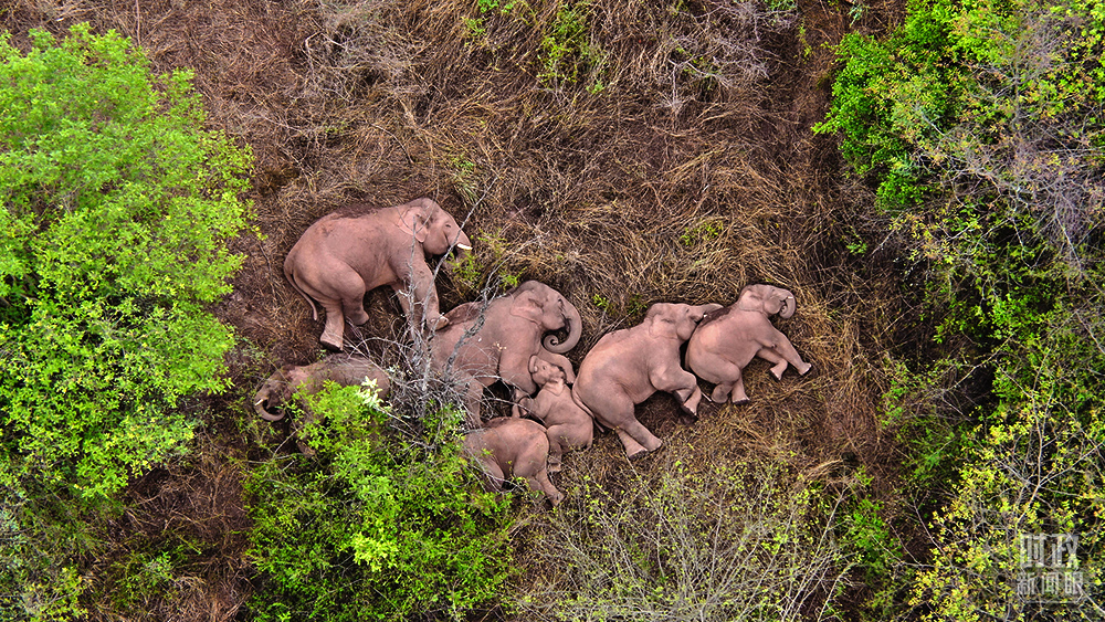 △2021年6月7日,云南省森林消防总队的无人机监测人员观测到野象群暂停迁徙的一幕。这是监测野象12天来,第一次发现象群集体躺着睡觉。(图/视觉中国)