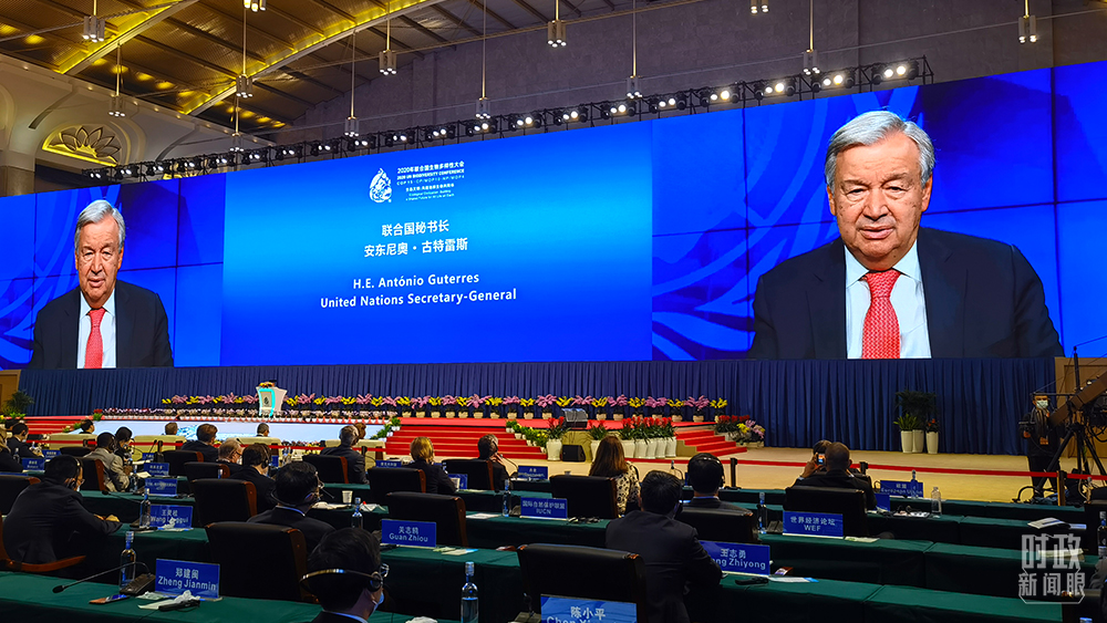 △联合国秘书长古特雷斯通过视频方式致辞。(总台央视记者舒贝拍摄)