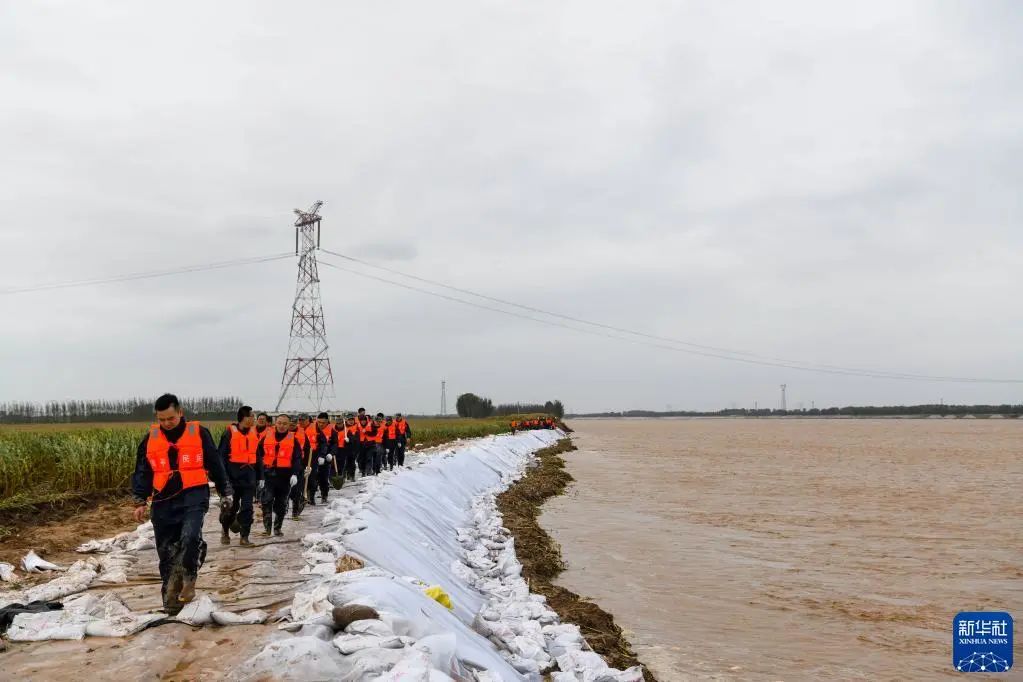 10月3日,在山东省邹平市码头镇段家村黄河生产堤上,抢险人员加固堤坝。图/新华网